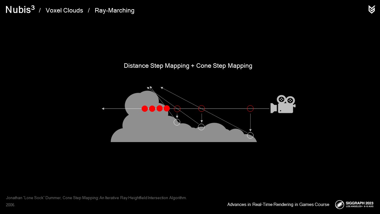 레이마칭을 할 때 표면 교차점에서 생성된 레이와 원뿔 사이의 교차 테스트를 수행하여 구름에 부딪히기 전에 취할 수 있는 가장 큰 단계를 결정했습니다. 거리 스텝 매핑은 이러한 원뿔 외부와 구름 외부 영역에 대해 너무 많은 샘플을 채취하지 않도록 하기 위해 사용되었습니다.