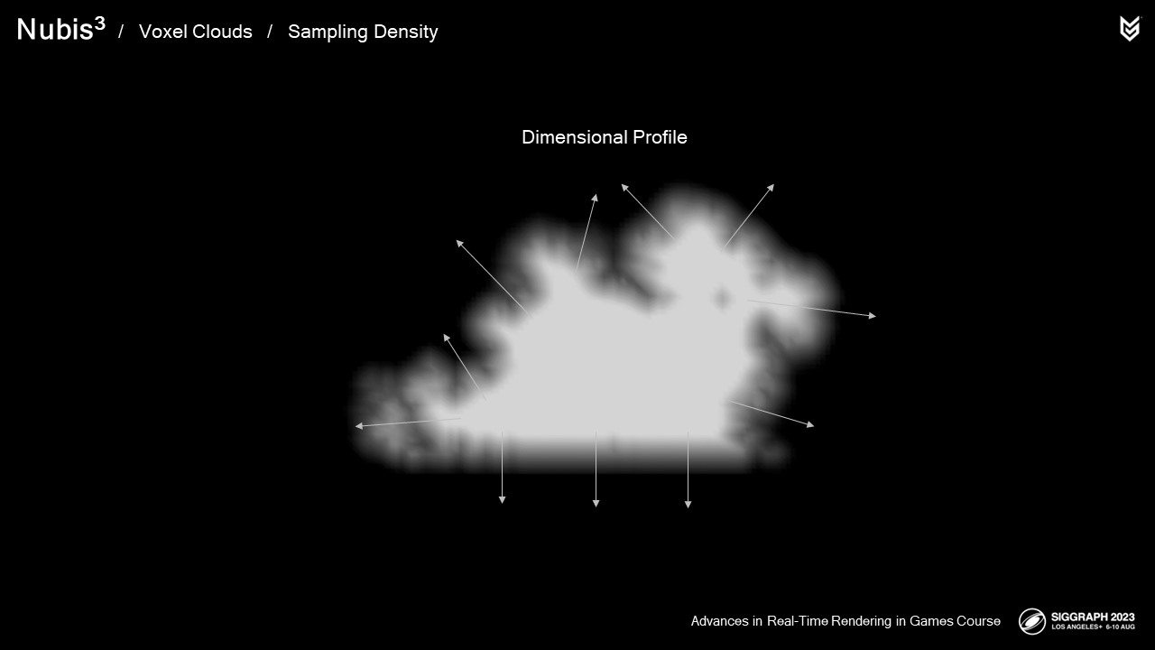 광선이 많은 광원으로 이동하지 않고 사방에서 구름으로 들어오는 주변광의 효과를 근사화하기 위해 이를 다시 한 번 확률 필드로 기하학적으로 모델링했습니다.
