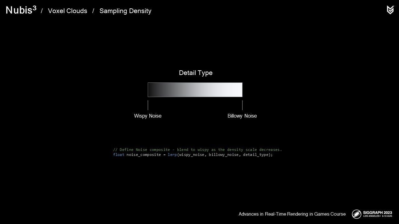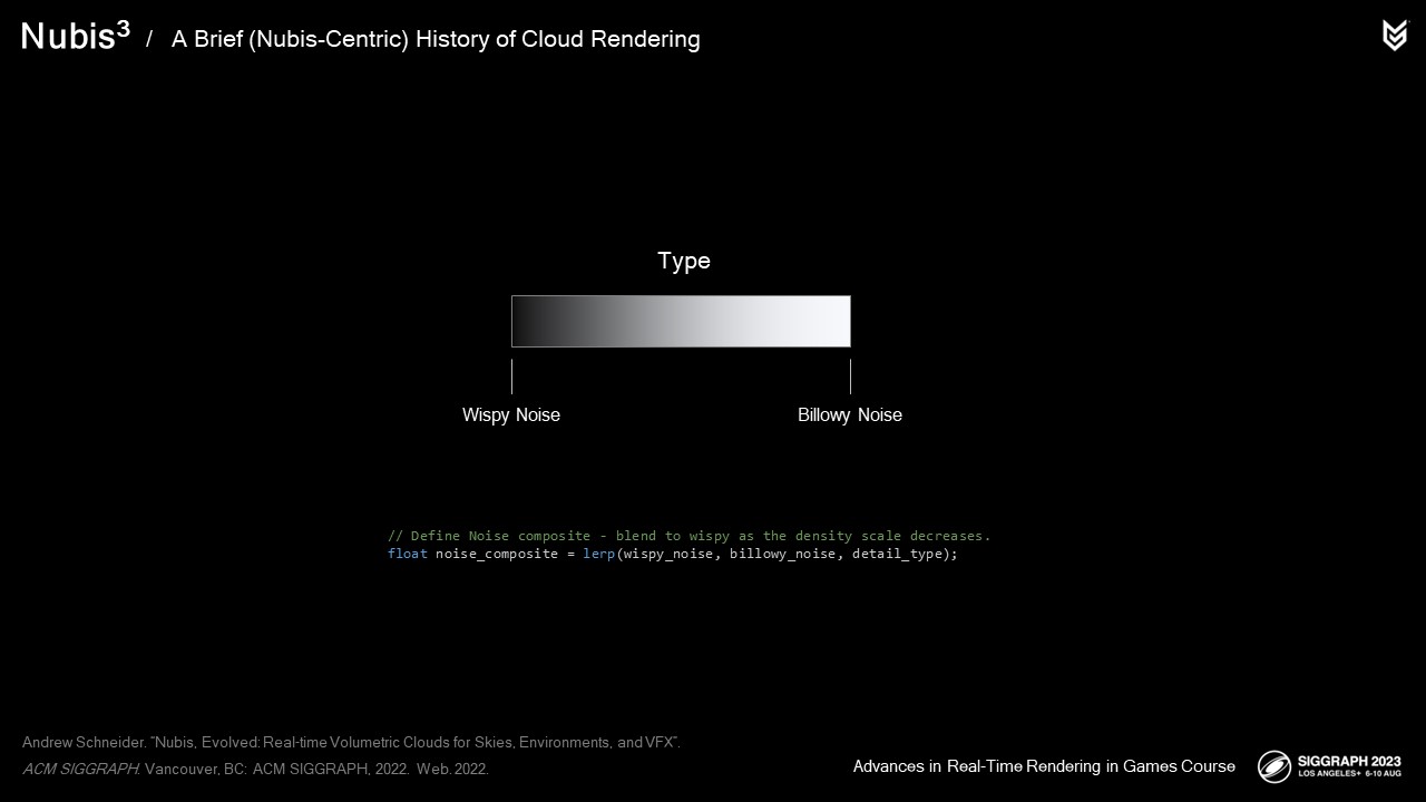 우리는 구름의 물결 모양의 디테일과 기복이 심한 디테일의 혼합을 시뮬레이션하기 위해 펄린-월리 노이즈라고 부르는 노이즈를 개발했고, 구름에서 보이는 기복이 심한 디테일을 시뮬레이션하기 위해 월리 노이즈를 사용했습니다.