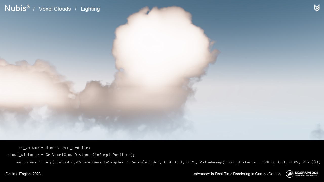 다중 산란은 빛이 물 분자와 여러 번 만나 굴절된 후 뷰 벡터로 흩어지는 것을 설명합니다. 구름이 깊어질수록 광자가 원래 경로에서 산란될 가능성이 높아지므로, 우리는 차원 프로파일을 확률 필드의 기초로 사용하여 내부 산란이 더 자주 발생하는 위치를 설명합니다. 여러 번 산란된 빛은 더 많이 산란될수록 결국 흡수되기 때문에 다른 비어-램버트 감쇠 곡선을 사용하여 이 필드를 감쇠시킵니다. 또한 아래에서 구름으로 산란되는 빛의 양이 적다는 사실을 고려하여 높이에 따라 감쇠시킵니다.
