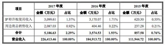 2015년, 2016년, 2017년 Happy Elements의 자체 IP 사업 매출은 각각 857.58만 위안, 3,574.53만 위안, 5,186.63만 위안을 기록했으며, 회사 영업수익 대비 비중은 각각 0.76%, 1.93%, 2.29%를 차지했습니다. 매출액과 비중 모두 자체 IP 사업이 급속한 성장 단계에 있음을 보여주고 있습니다.