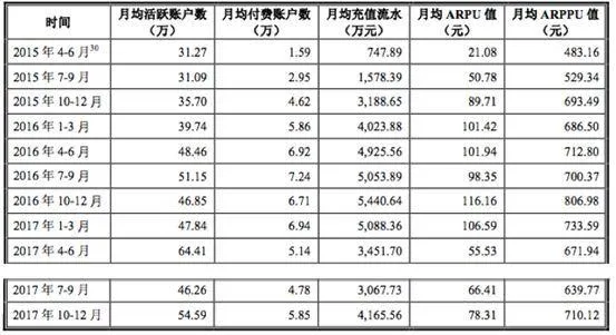 2017년 10-12월 기준, 월간 매출액은 4,165.56만 위안(최고치 5,440.64만 위안), 월평균 ARPPU는 710.12위안(최고치 806.98위안), 월평균 활성 사용자 수와 유료 계정 수는 각각 54.59만 명(최고치 64.41만 명)과 5.85만 명(최고치 7.24만 명)을 기록했다.