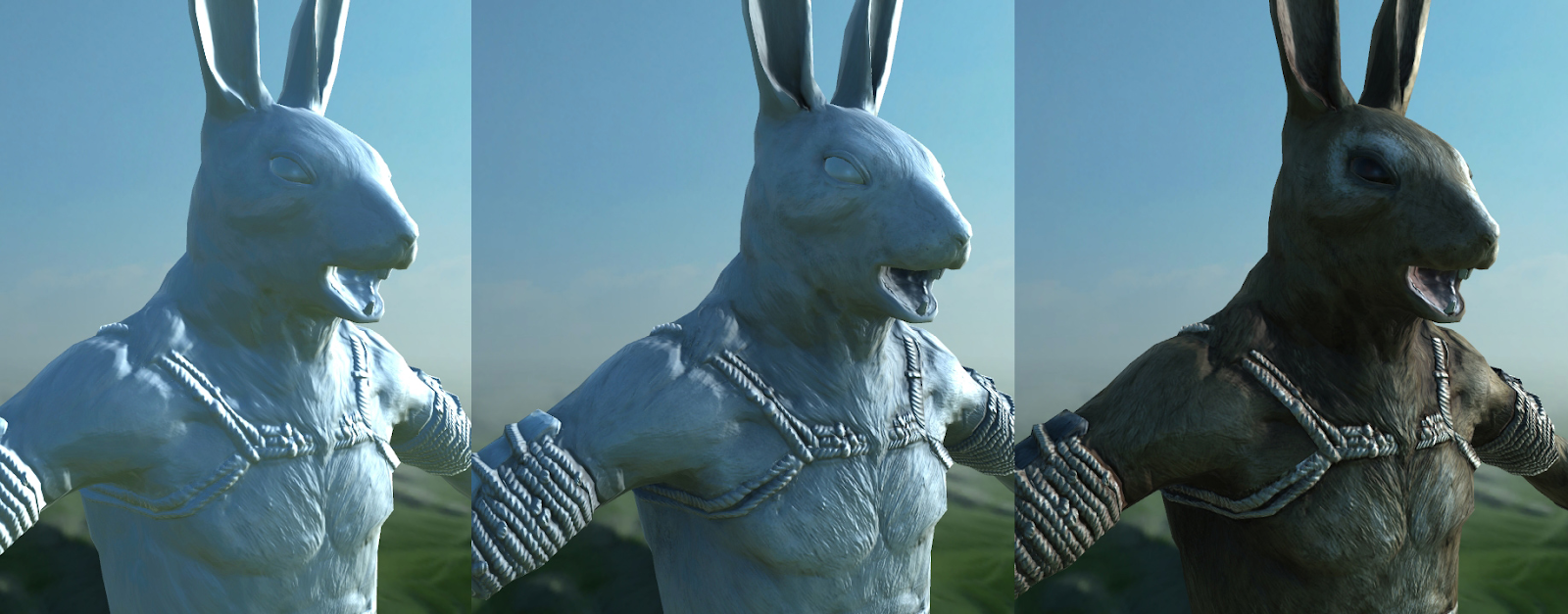 观察[图34]可见,最左侧为未应用镜面遮蔽的基础渲染效果,中间为应用了镜面遮蔽的着色状态,最右侧为最终渲染效果。若不使用光线追踪等技术,在没有镜面遮蔽的情况下,很难避免光线泄漏等渲染问题。