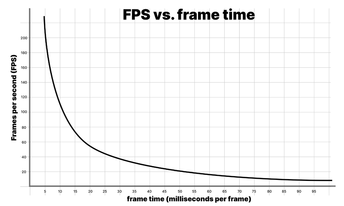 게이머가 성능을 측정하는 일반적인 방법은 프레임 속도 또는 초당 프레임입니다. 그러나 대신 밀리초 단위의 프레임 시간을 사용하는 것이 좋습니다. 그 이유를 이해하려면 fps와 프레임 시간의 그래프를 살펴보세요.