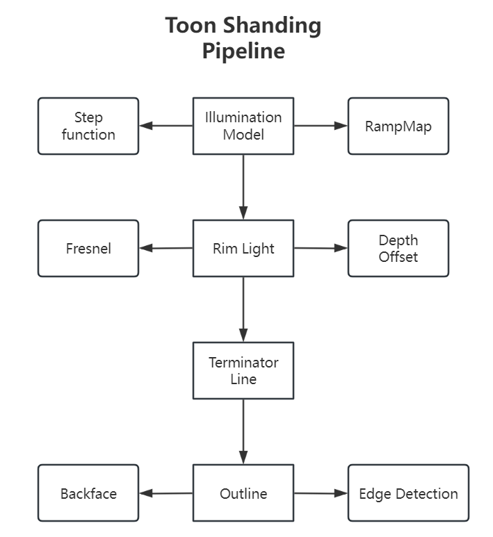 일반적인 툰 셰이딩 파이프라인은 크게 네 단계로 나뉩니다: 조명 모델, 림 라이트, 종결선, 외곽선.