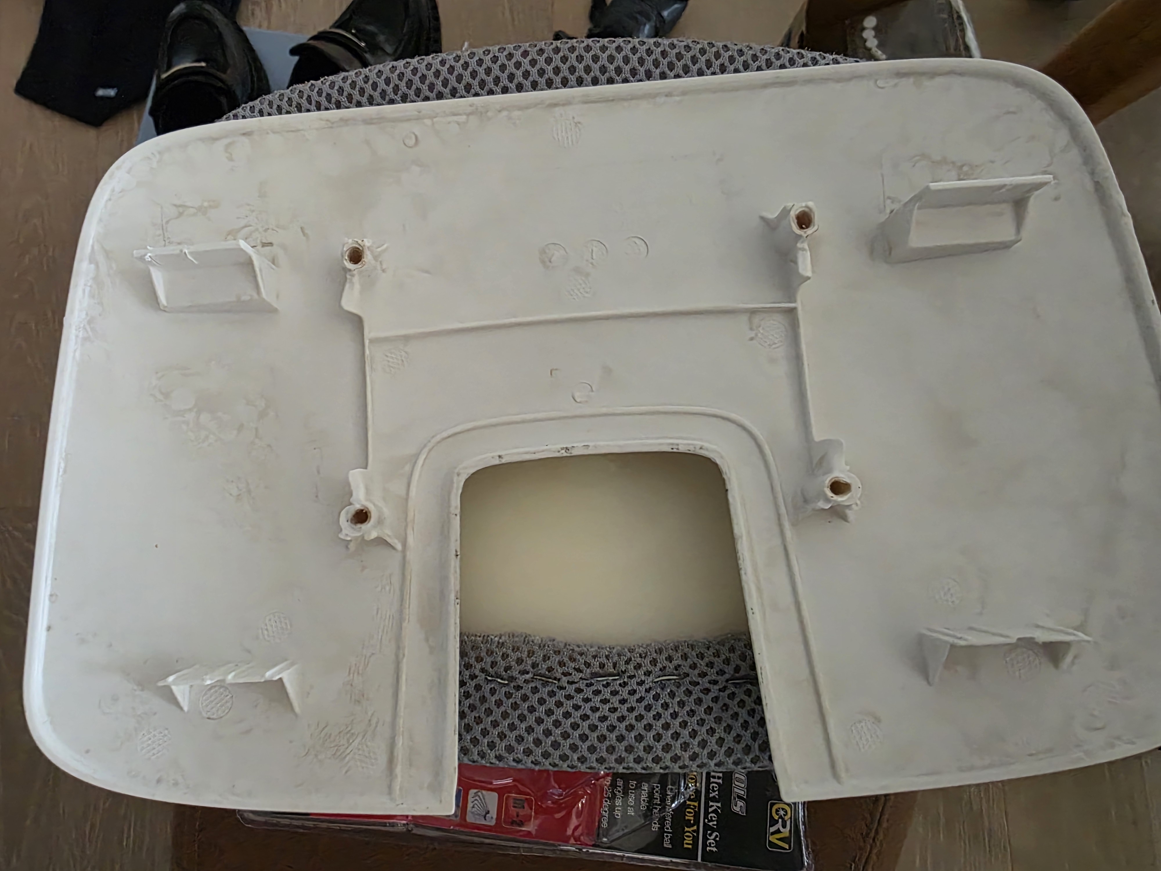 이걸 때어내는게 가장 힘든데 의자 등받이 뒤판 홈으로 손을 넣어 별모양 렌치로 끙끙 거리면서 풀어야한다. 손이 큰 분은 힘들것 같다. 30분 정도 끙끙 거리면서 해체하고 나면 어려운건 이제 없는 단계.