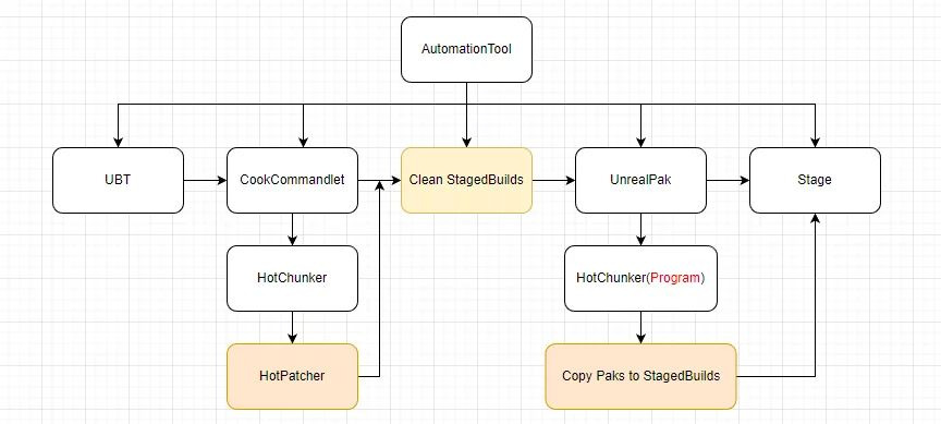 Cook을 예로 들면, CookCommandlet을 실행합니다. 기본적으로 엔진은 Cook의 각 단계에 개입할 수 있는 방법을 제공하지 않습니다. 패키징 과정에서 일부 작업을 수행하려면 UAT를 직접 조작하여 빌드 프로세스를 분리하고 각 프로세스를 직접 관리해야 합니다.