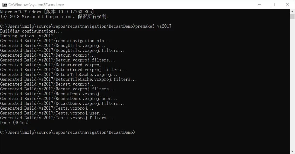 recastnavigation\\RecastDemo 디렉토리에서 premake5 vs2017 명령을 실행합니다(vs201x는 현재 시스템에 설치된 버전에 따라 다릅니다). 이 명령은 RecastDemo 디렉토리에 build/vs2017 디렉토리를 생성하며, 여기에 VS 프로젝트 솔루션이 포함됩니다.