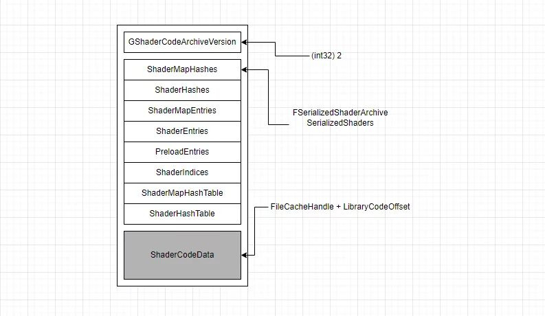 TArray<FShaderCodeEntry> ShaderEntries;// Archive에 저장된 모든 ShaderCode 오프셋 배열(Unique Shader 수량), ShaderCode 실제 읽기 시 offset, Size 및 압축 해제 후 크기 접근용