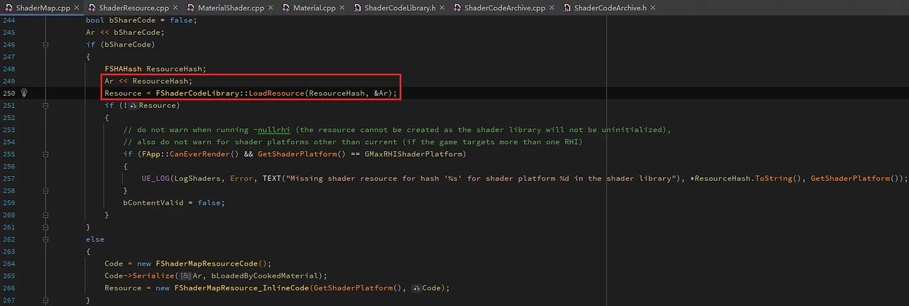 읽기 시에는 이 FSHAHash 값을 통해 FShaderCodeLibrary::LoadResource를 사용하여 로드합니다:
