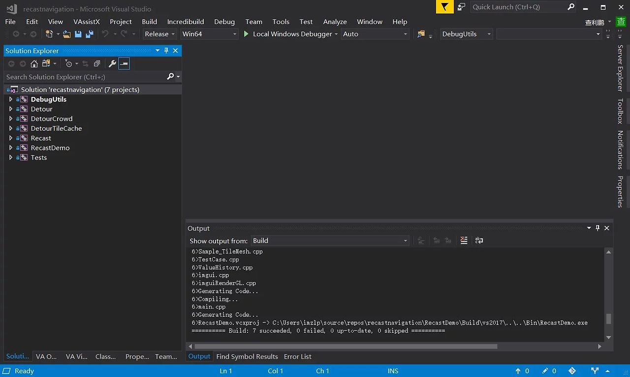 RecastDemo\Build\vs2017\recastnavigation.sln을 열고 컴파일합니다.