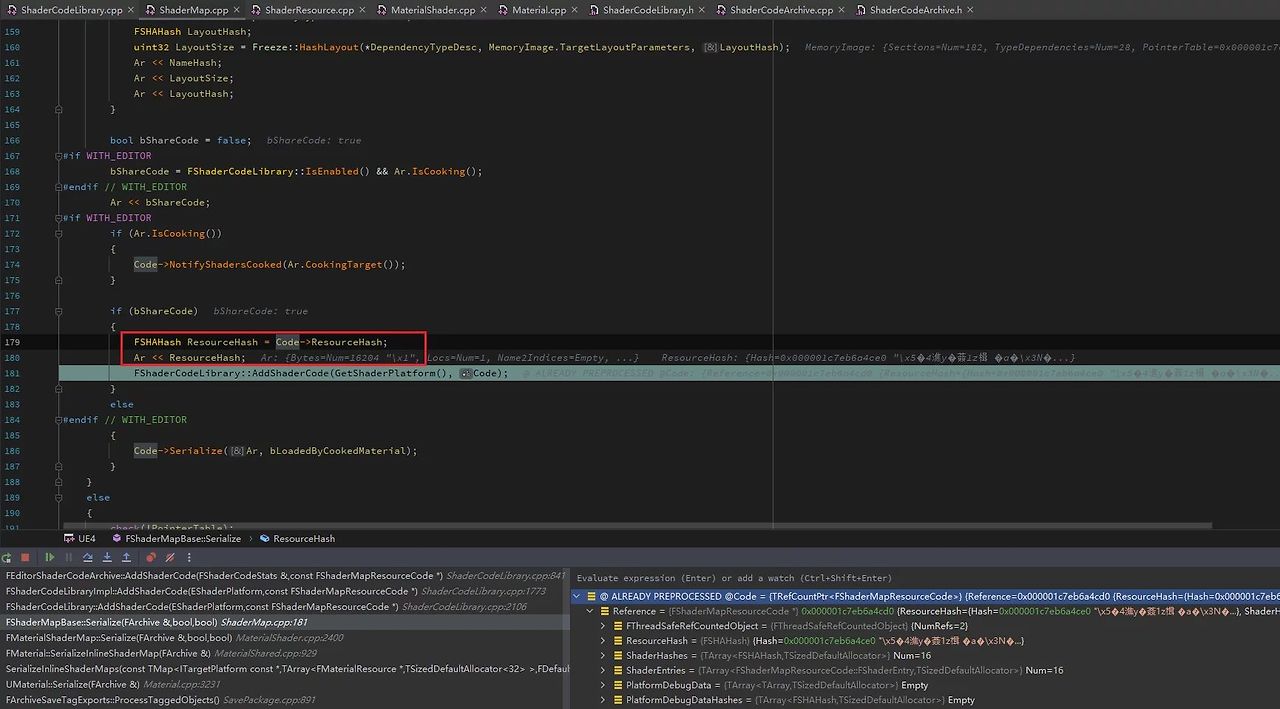 - Material은 직렬화 시(bShareCode 활성화), ShaderMap의 HASH를 uasset에 직렬화하여 런타임에서 해당 ShaderMap을 쉽게 조회할 수 있게 합니다.