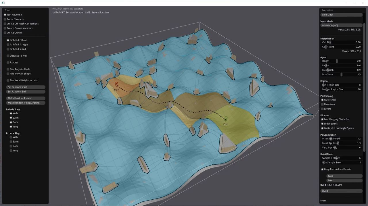 recastnavigation 코드에는 RecastDemo라는 내비게이션 메시 생성 및 경로 찾기 계산 도구가 포함되어 있어, 프로젝트에 RecastNavigation을 통합하는 예제로 활용할 수 있습니다.