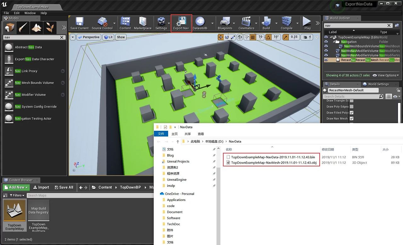 먼저, UE에서 내비게이션 데이터를 내보내야 합니다. 여기서는 .bin 파일만 필요하며, 예를 들어 D:\\NavData에 생성됩니다.