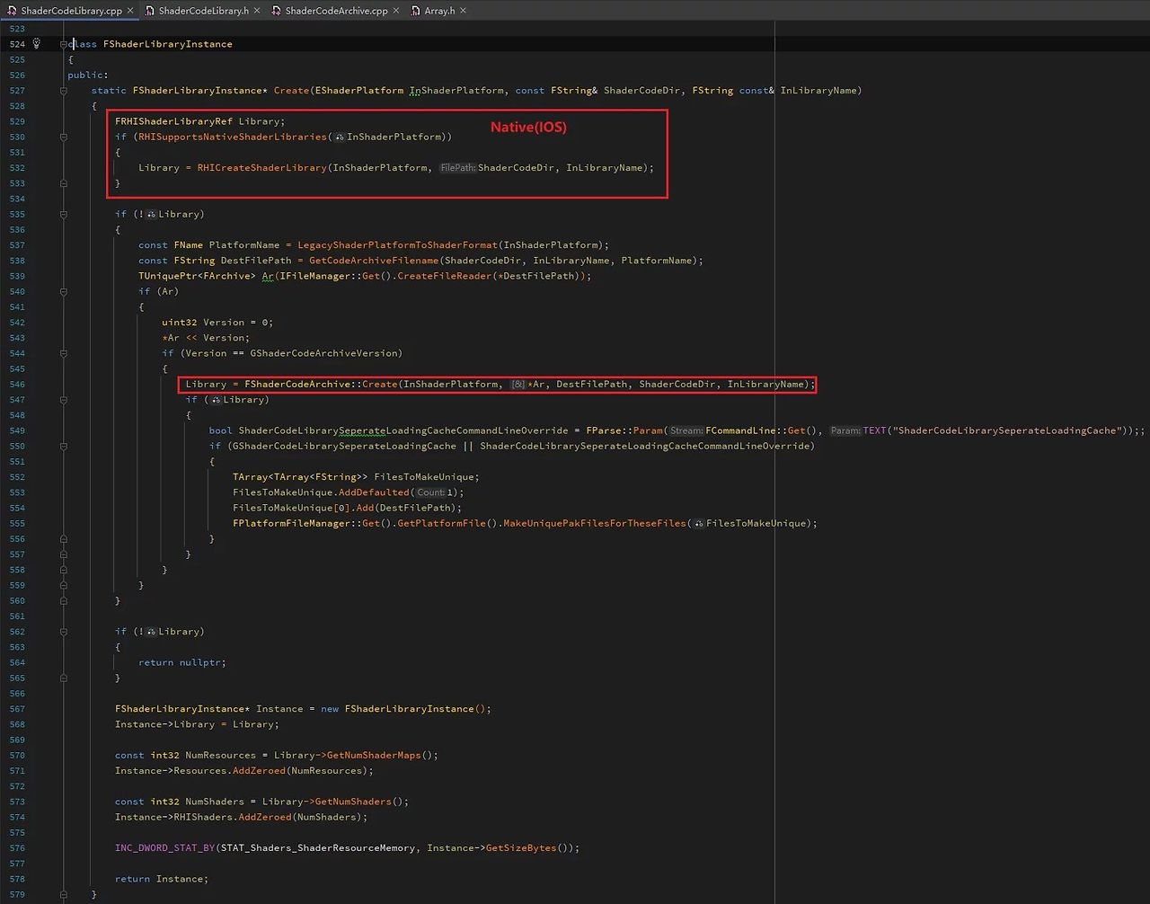 런타임에서 FShaderCodeLibrary의 OpenLibrary로 ushaderbytecode를 로드할 때, 파일 전체를 메모리에 로드하지 않고 GShaderArchiveVersion과 FSerializedShaderArchive 구조만 직렬화합니다: