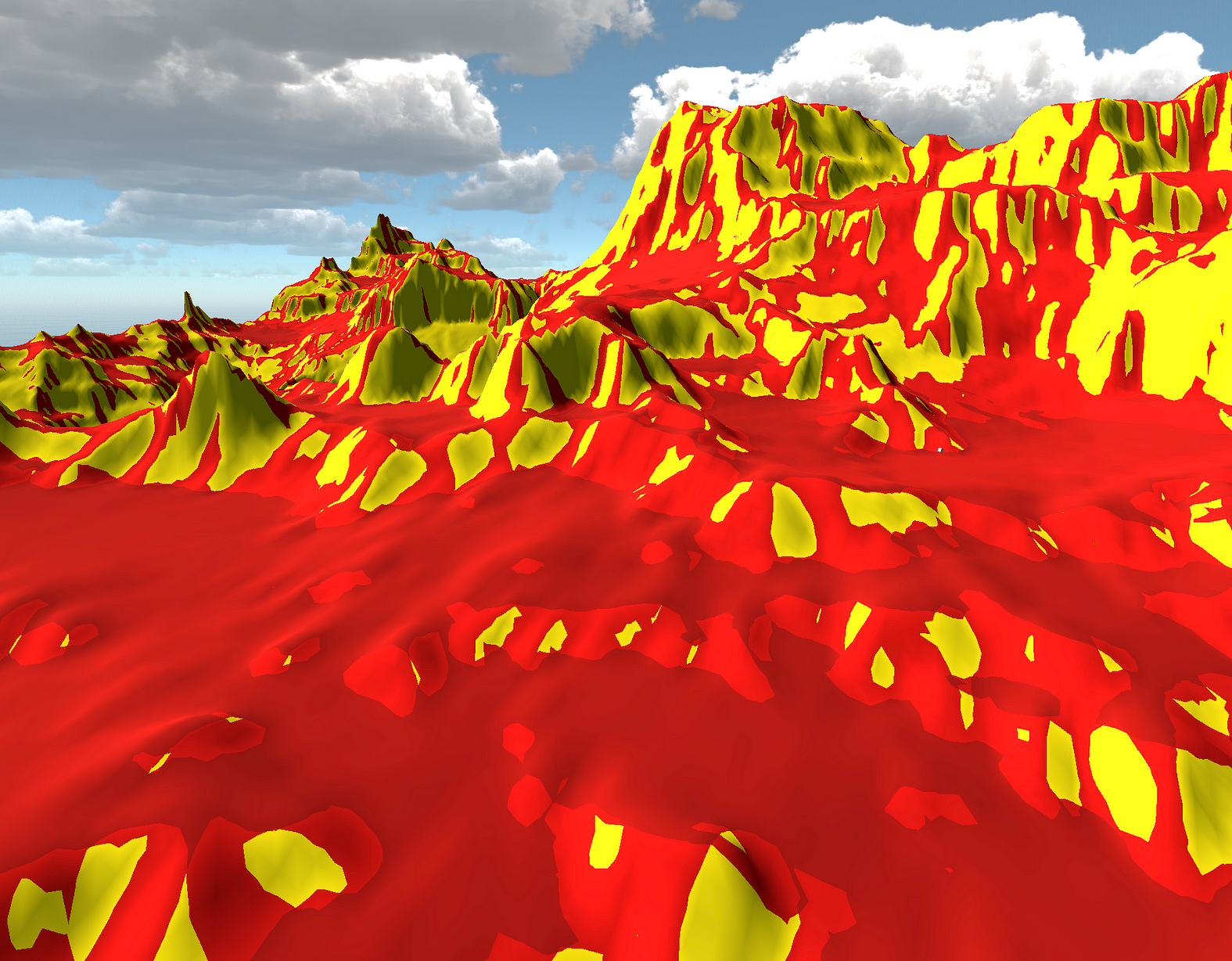 MicroSplat에서 삼평면 브랜치를 시각화합니다. 밝은 영역은 더 많은 가지에 대해 사실로 테스트되었습니다.