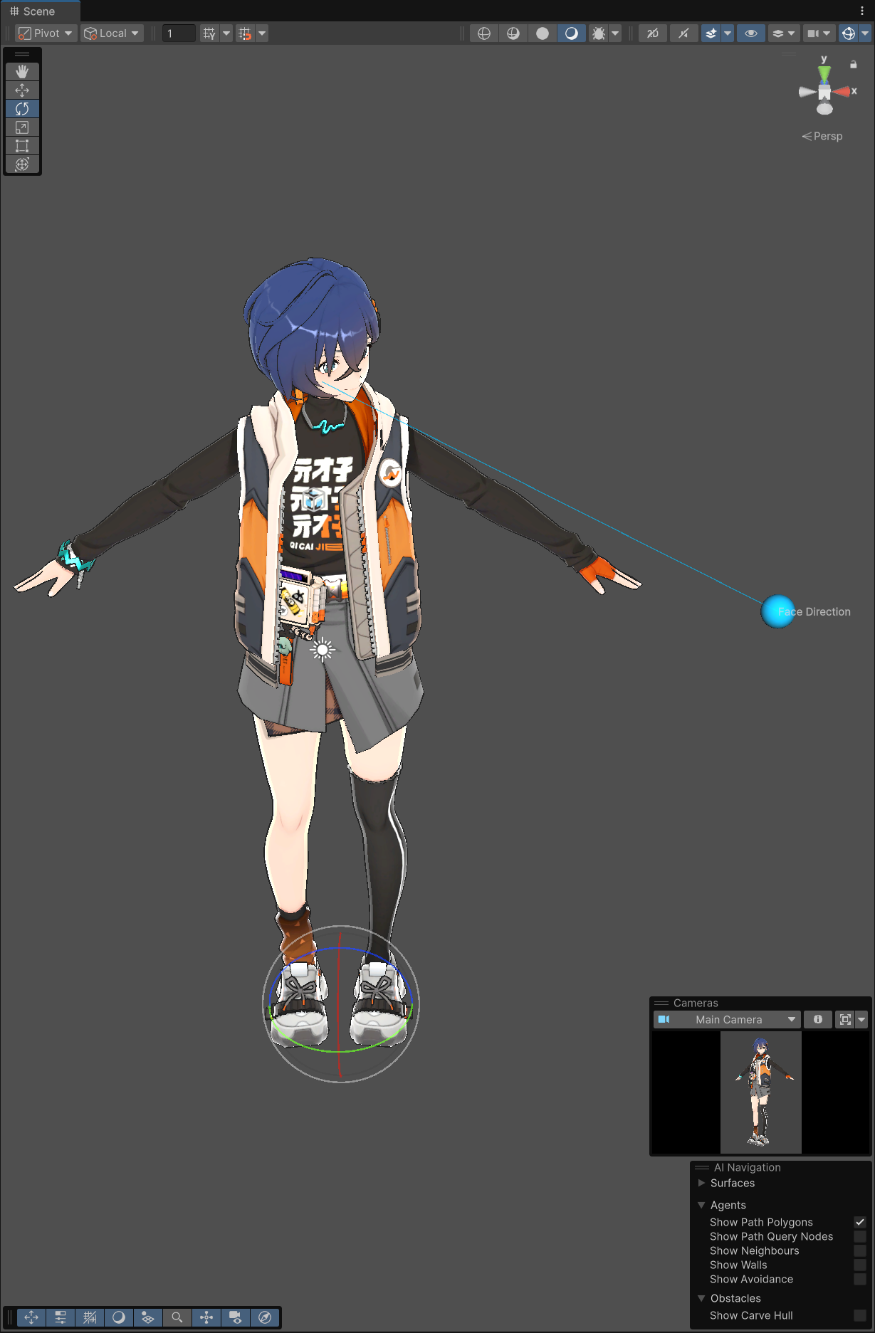 “LateUpdate()” 함수에서 “direction” 변수에 “bipHeadDirection”이라는 로컬 기준 벡터에 “bipHead”의 회전을 곱해, 현재 머리 본이 바라보는 월드 기준 방향을 계산한다. 이렇게 얻은 벡터는 캐릭터의 얼굴이 어느 쪽을 향하고 있는지를 대입하고 매 프레임마다 갱신한다.