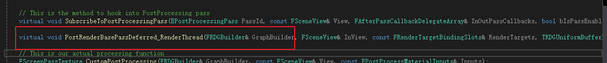 void FCustomSceneViewExtension::PostRenderBasePassDeferred_RenderThread(FRDGBuilder& GraphBuilder, FSceneView& InView, const FRenderTargetBindingSlots& RenderTargets, TRDGUniformBufferRef<FSceneTextureUniformParameters> SceneTextures)