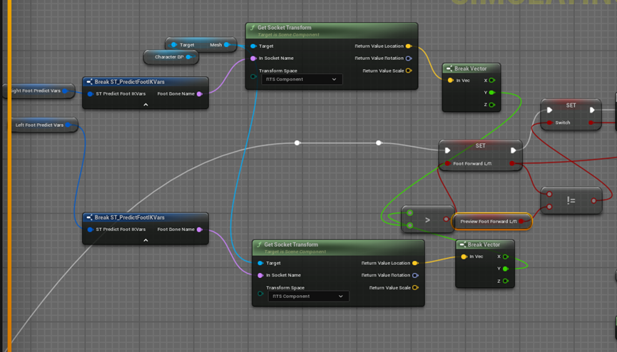 공중 떨림의 원인: 착지 후 일반 IK를 사용할 때 Predict의 FootLocation이 업데이트되지 않습니다. PredictFootIK로 전환할 때 발 위치가 여전히 점프 위치에 머물러 있어 떨림이 발생합니다.