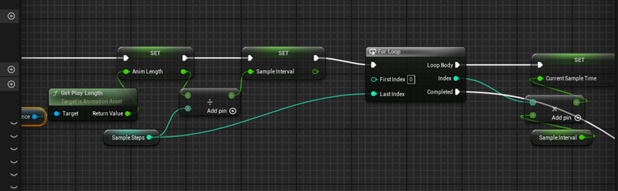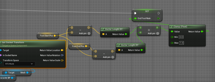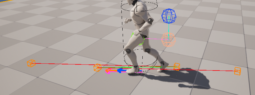 주의사항: 종료점은 발이 착지할 때 지속적으로 업데이트되어야 합니다. 앞서 언급했듯이 착지점에 오차가 있어 점차 캐릭터 쪽으로 접근하기 때문에, 특정 프레임의 데이터만 사용하면 맞지 않습니다. 따라서 Pelvis의 착지점도 발이 착지할 때 계속 업데이트해야 합니다.