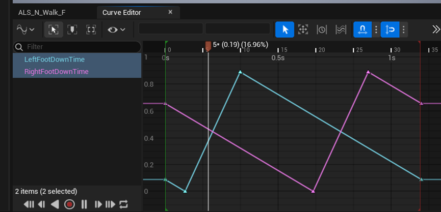 최후에 발이 내려가는 키 포인트와 발이 올라가는 키 포인트를 연결하여 커브를 생성합니다.