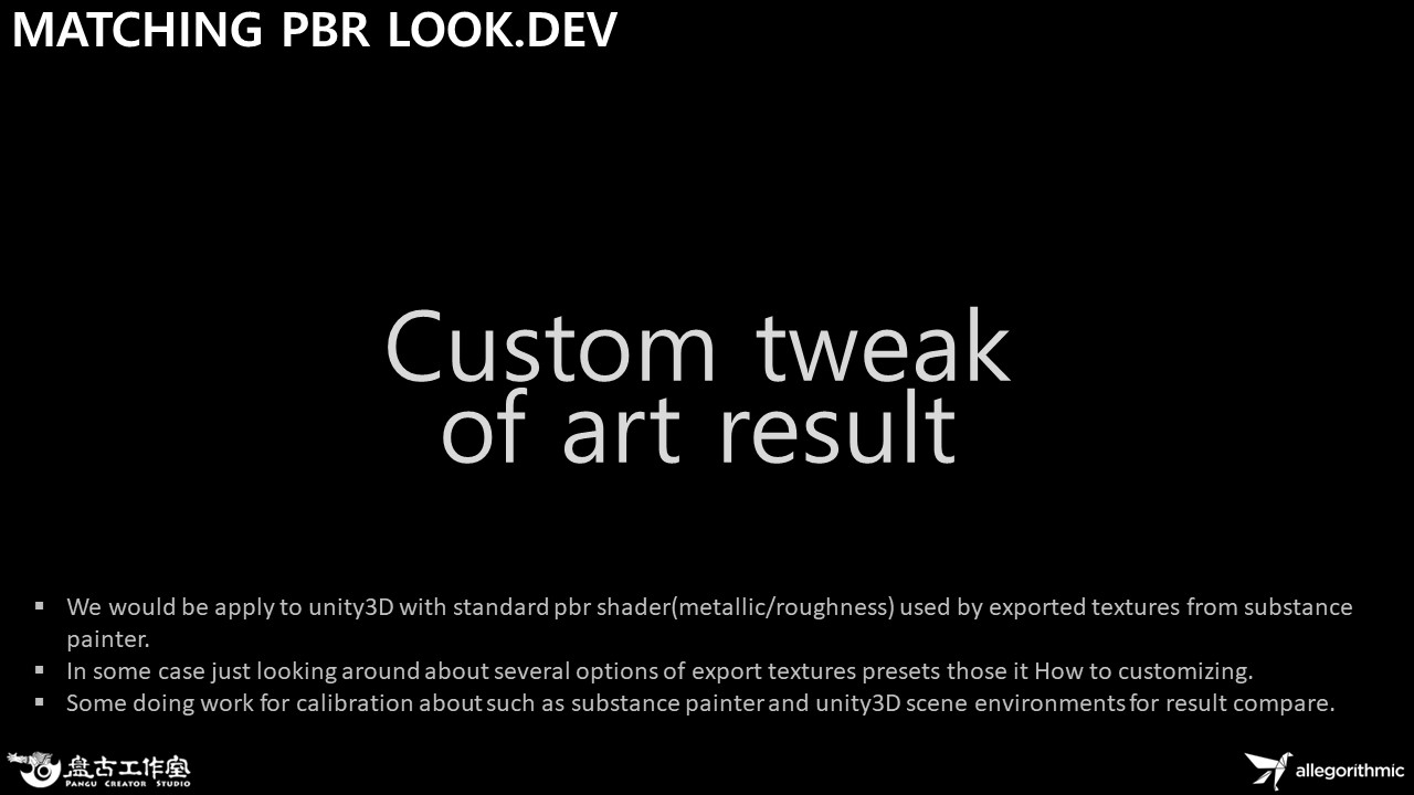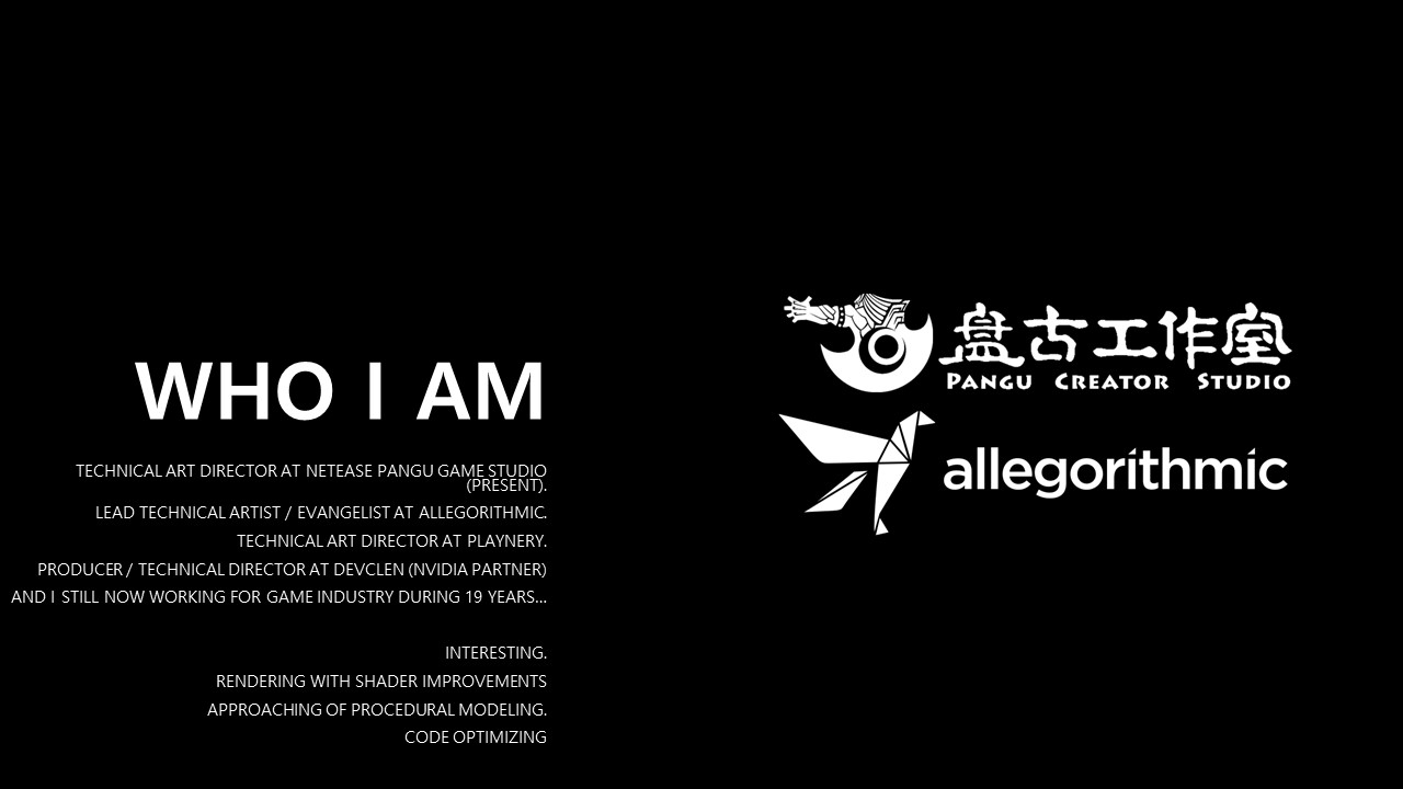 안녕하세요. 넷이즈 항저우 반구 스튜디오에서 테크니컬 아트디렉터로 일 하고 있는 이정표 입니다. 이렇게 상해에서 여러분을 만나게 되어 기쁘고 설래입니다. 넷이즈에 합류 하기 이 전에 저는 알레고리드믹의 리드 테크니컬 아티스트로 근무 하면서 여러 기업을 서포트 하는 일을 했습니다. 물론 서브스턴스 디자이너 개발팀과 많은 교류를 하며 PBR 워크플로 개념에도 기여 했습니다.