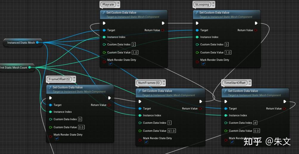 버텍스 애니메이션 재생을 제어하기 위해 5개의 CustomData가 도입되었으며, Actor에서 SetCustomDataValue를 통해 설정해야 합니다.