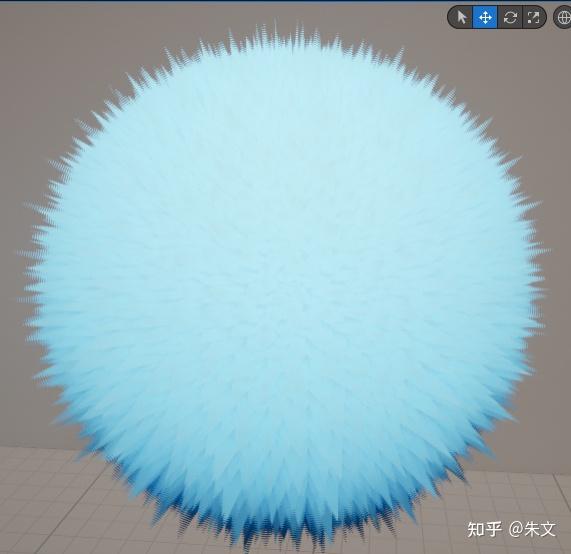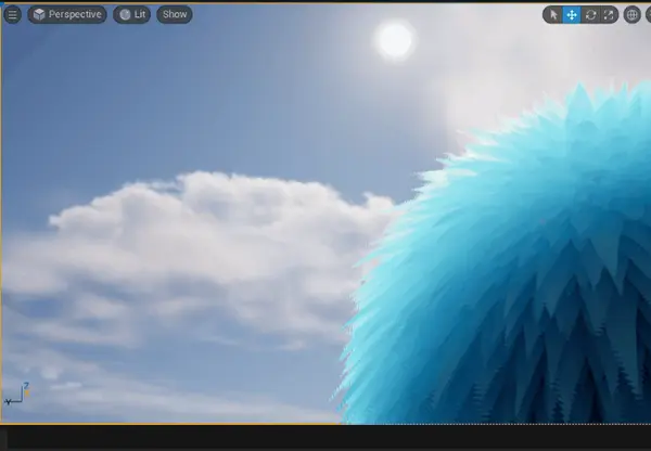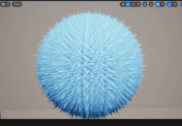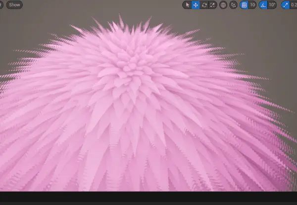모발 구체의 기본 형태가 구현되었지만, 발광하는 듯한 부자연스러운 모습입니다. ISMC의 그림자 투사를 비활성화했기 때문이며, 다음 단계에서 렌더링과 물리 효과를 추가로 구현하겠습니다.