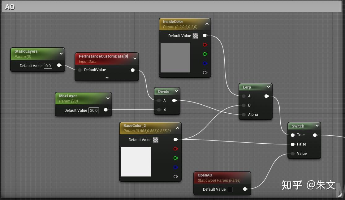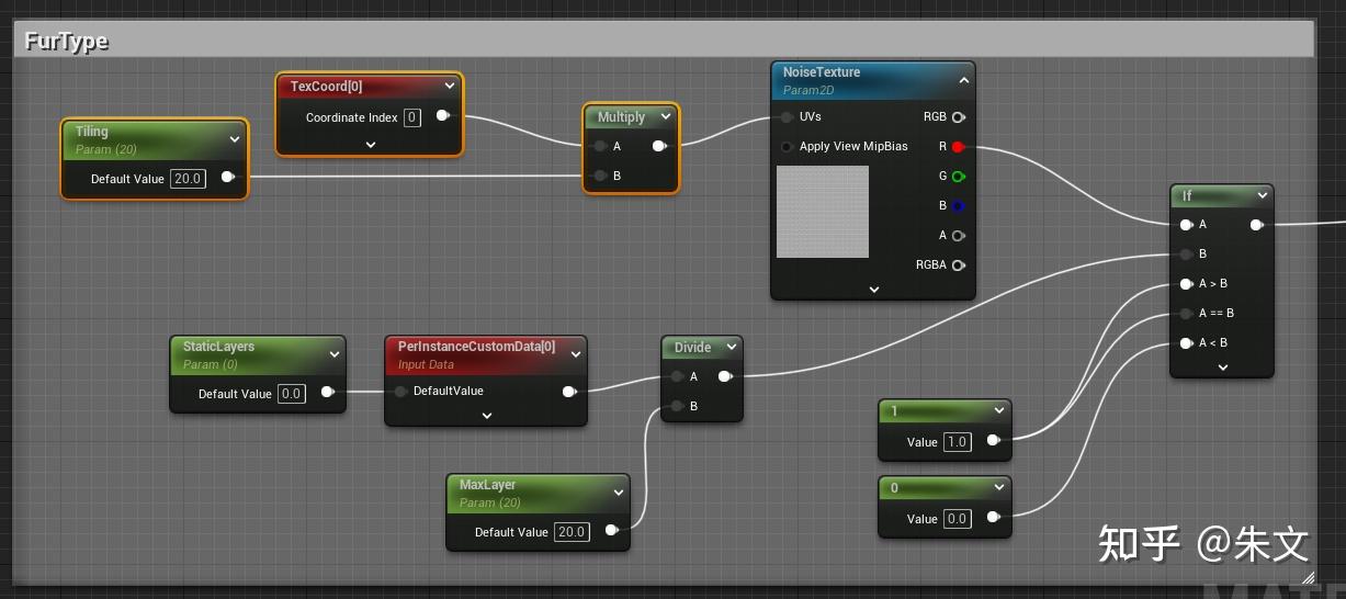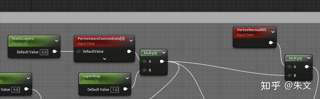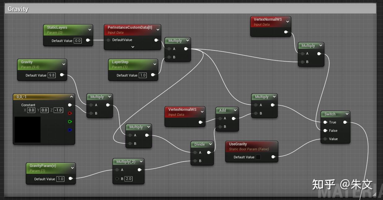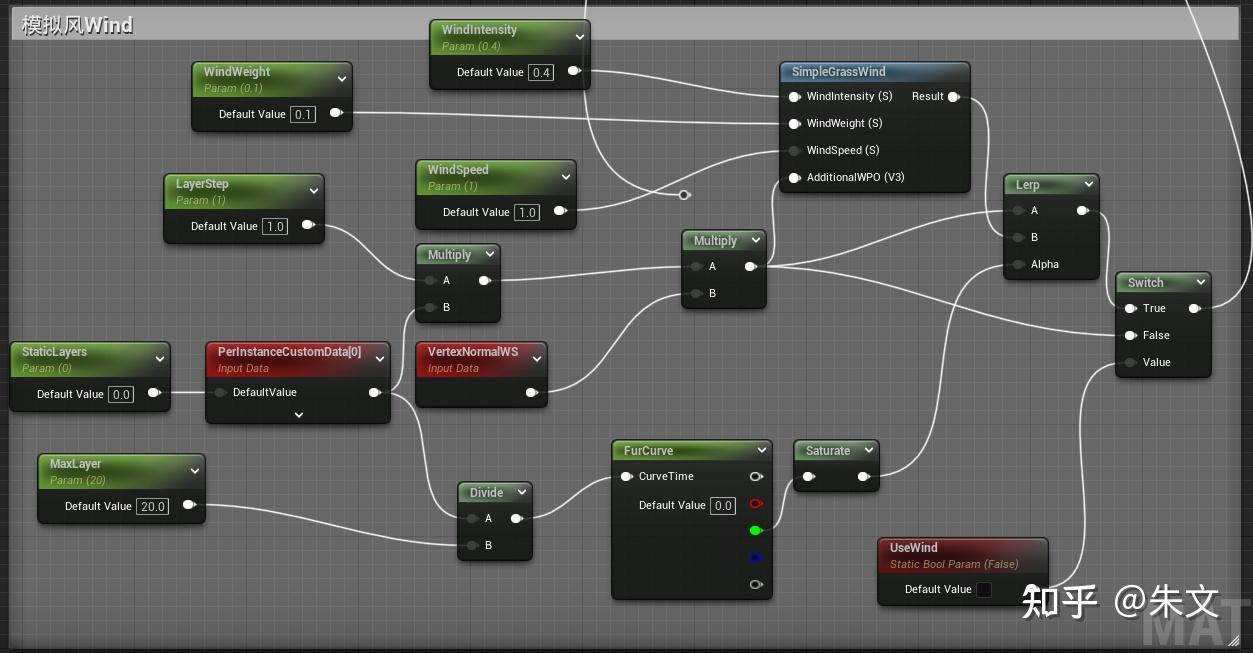 UE에서 제공하는 SimpleGrassWind 머티리얼 노드를 직접 사용하며, 모발 레이어 번호를 Alpha 값으로 사용하여 선형 보간을 수행합니다. 이를 통해 모발 끝부분이 더 많은 힘을 받고, 뿌리 부분은 더 적은 힘을 받도록 합니다.