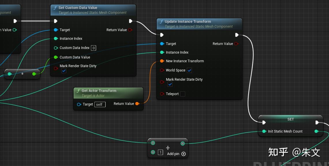 SetCustomDataValue 함수: CustomData를 설정합니다. 이 데이터는 머티리얼에서 PerInstanceCustomData 노드를 통해 읽어올 수 있으며, 이를 활용하여 GPU 버텍스 애니메이션 제어 및 각 인스턴스에 레이어 정보를 전달합니다.