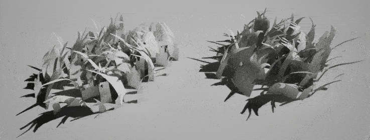 먼저 여전히 스프링 질점 시뮬레이션을 하지만, 모델의 높이에 따라 정점이나 파티클로 표현된 제약 관계를 RT로 변환합니다. 그런 다음 식생이 샘플링할 때 높이에 따라 다른 레벨을 샘플링할 수 있고, 결과를 오프셋으로 사용하여 식생 정점 위치를 오프셋하도록 구동합니다. 효과의 경우 제 테스트 과정의 비디오를 볼 수 있습니다: