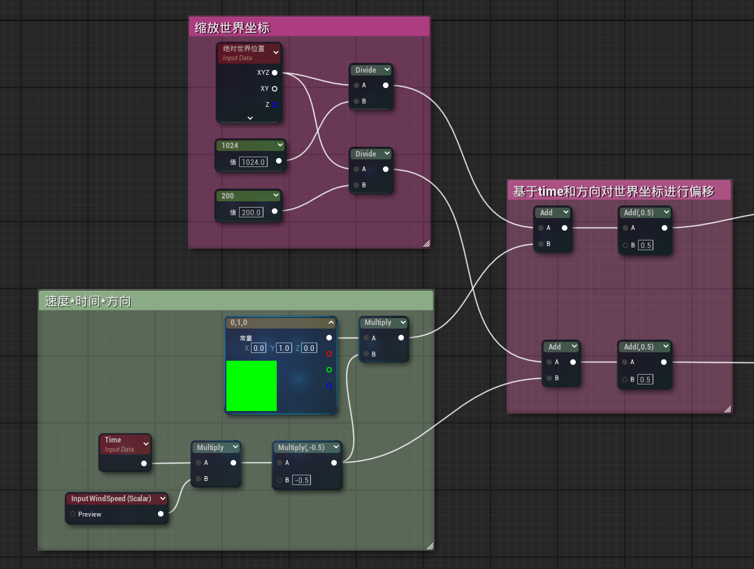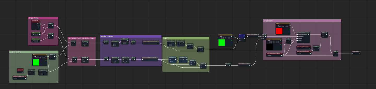 스무딩 함수를 추가한 후 잔디 바람 움직임 표현이 더 자연스러워지는 것이 분명합니다. 이제 문제로 돌아가면, UE의 이 방안은 무엇을 표현했을까요? 또는 쓰시마는 어떻게 노이즈에서 회전 파티클로 확장했을까요? 주기 계산 부분을 생성하는 바람 움직임으로 돌아가겠습니다: