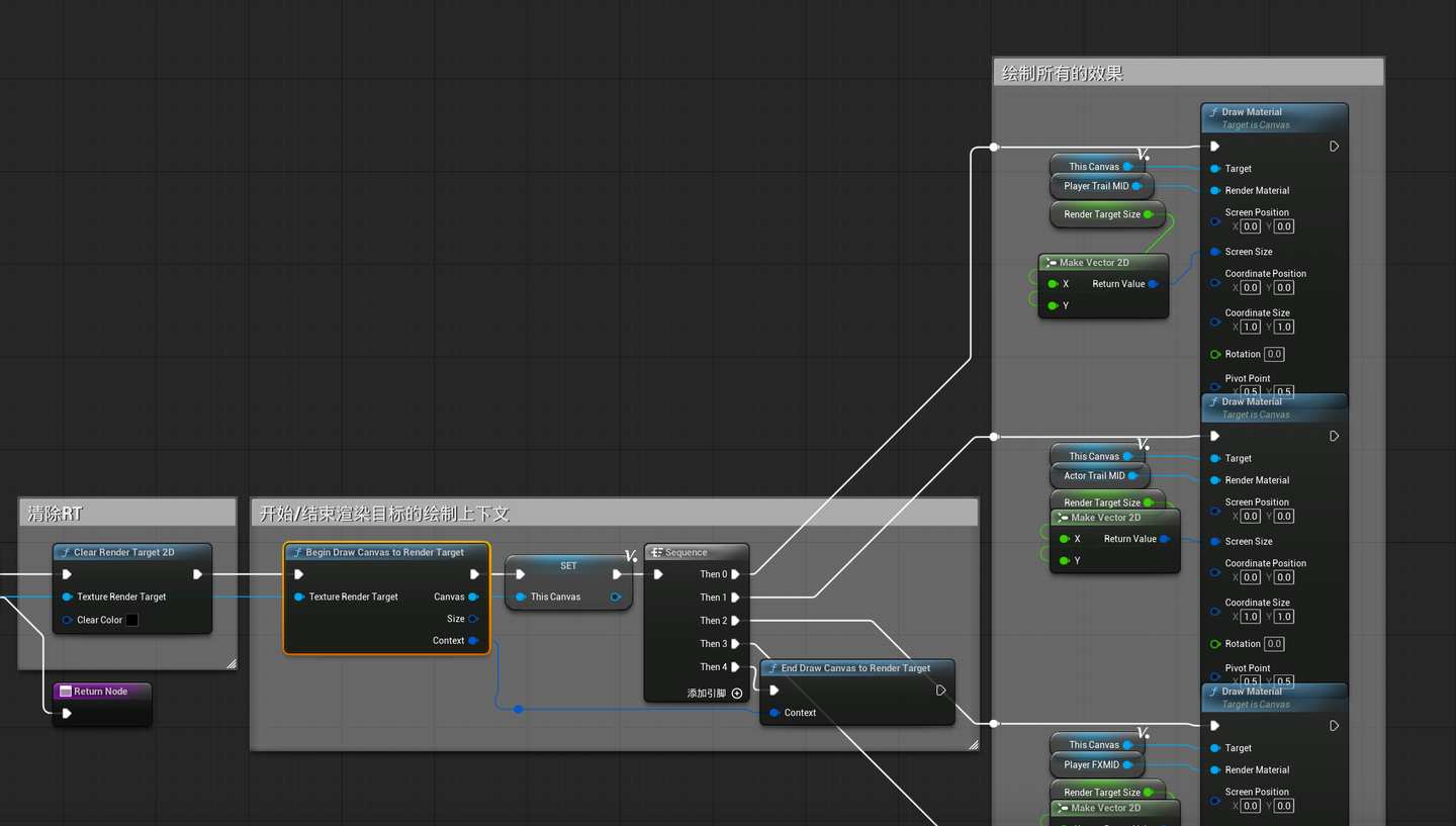 일정 Velocity를 초과한 후, 현재 캐릭터 액터가 유효하다는 것을 나타내며, RT에 그려야 합니다. 직접 여러 번 Draw Material을 사용하여 Canvas를 RT에 그립니다:
