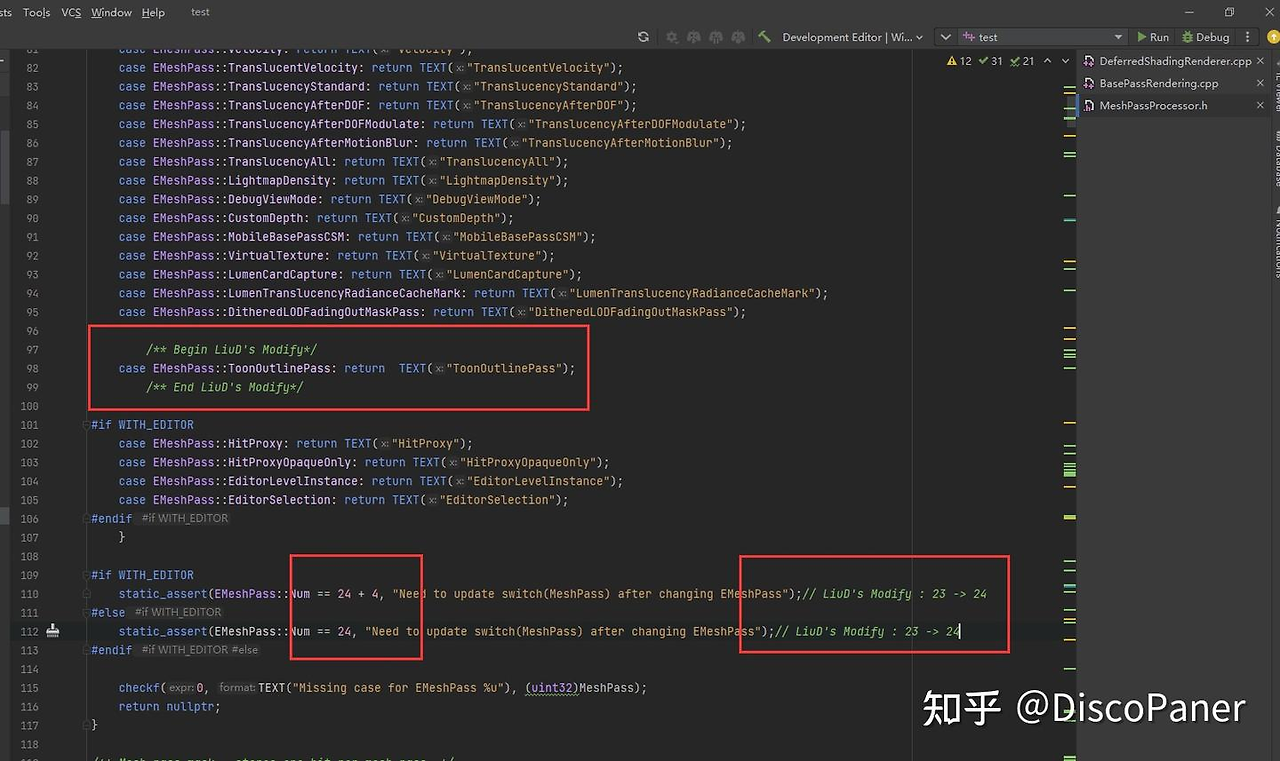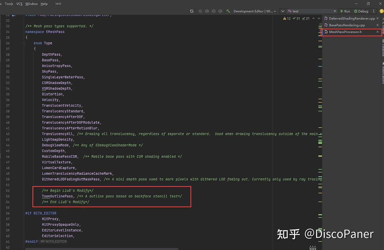 UnrealEngine\\Engine\\Source\\Runtime\\Renderer\\Public\\MeshDrawProcessor.h 파일을 열어서 커스텀 MeshDrawPass 열거형을 추가한다.