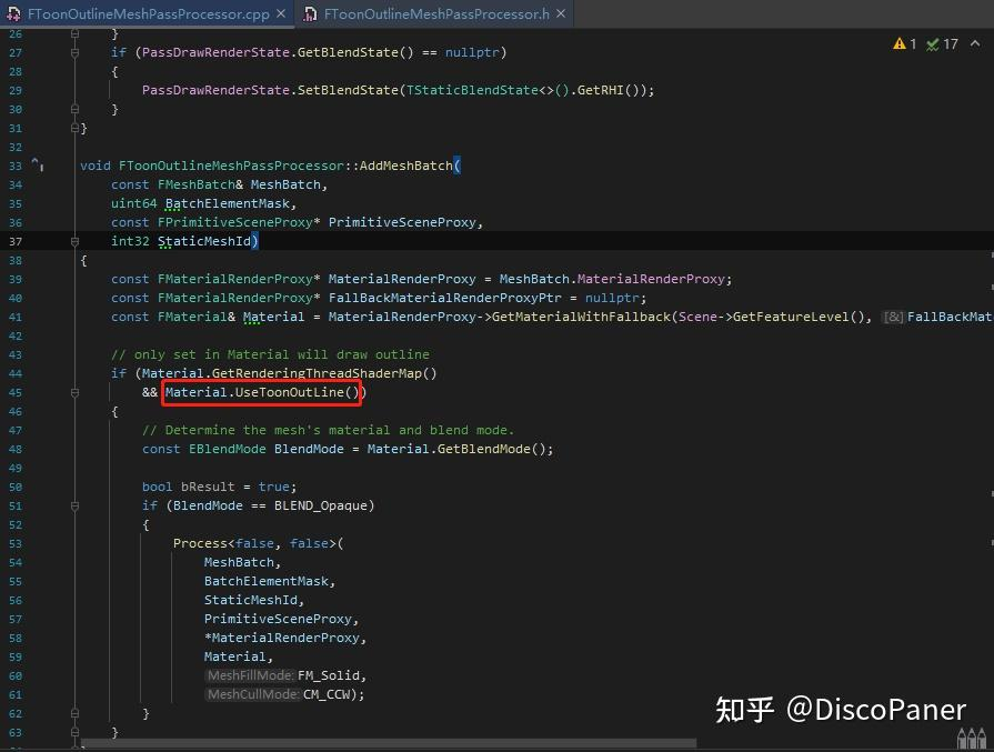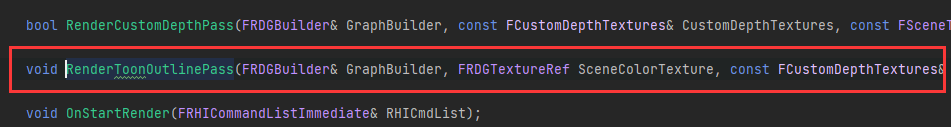FToonOutlineMeshPassProcessor의 선언 코드는 다음과 같다: