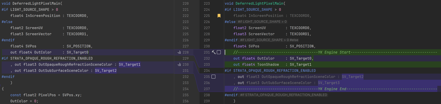 FDeferredLightPS 에 Render Target 을 하나 더 추가해서, Main Light 를 계산하는 타이밍에 동시에 Shadow 값을 ToonShadowTexture 에 써 주도록 한다.