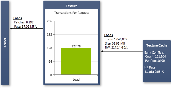 각 워프가 텍스처 메모리에서 읽기를 수행할 때마다 이는 단일 페치로 계산됩니다. 텍스처 차트는 페치의 수와 페치 속도를 보여줍니다. 텍스처 페치는 메모리 요청이며, 이로 인해 텍스처 캐시에서 트랜잭션이 발생합니다. 텍스처 캐시로부터의 트랜잭션은 32바이트 단위입니다.
