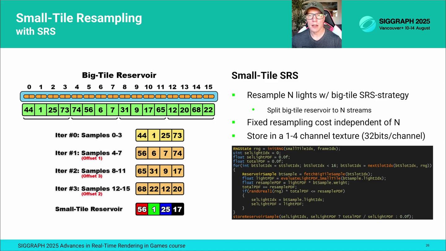 그 다음 SRS의 다음 반복에서는 다음 16개의 조명 그룹으로 건너뛰고, 이번 반복에 사용할 랜덤 오프셋을 생성한 뒤, 스트림 인덱스에 모듈로 16 오프셋을 더해 스트림을 랜덤하게 섞습니다. 이렇게 스트림을 섞는 이유는, 중요도가 높은 조명들이 여러 대타일과 여러 프레임에서 같은 저장소 슬롯만 두고 경쟁하는 상황을 피하기 위해서입니다.