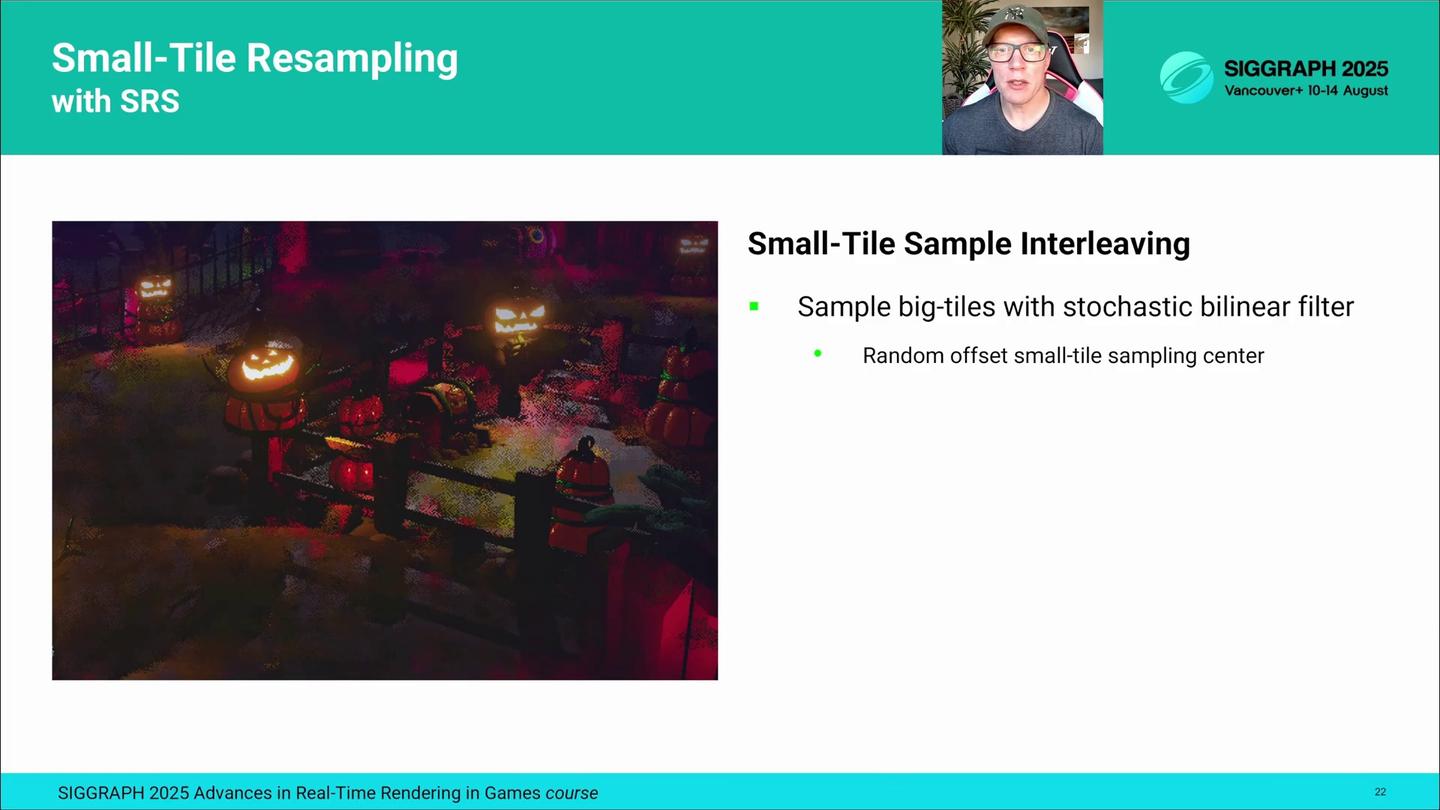 그 다음 "소(小) 타일 재샘플링(Small-Tile Resampling)" 단계에서, 각 대타일의 저장소에서 다시 한 번 SRS를 수행해 소타일에 사용할 소수의 조명을 뽑습니다. 이때는 더 정교한 PDF를 사용하며, 여기에는 보다 정확한 조명 가시성 정보와 BRDF 항이 포함됩니다.