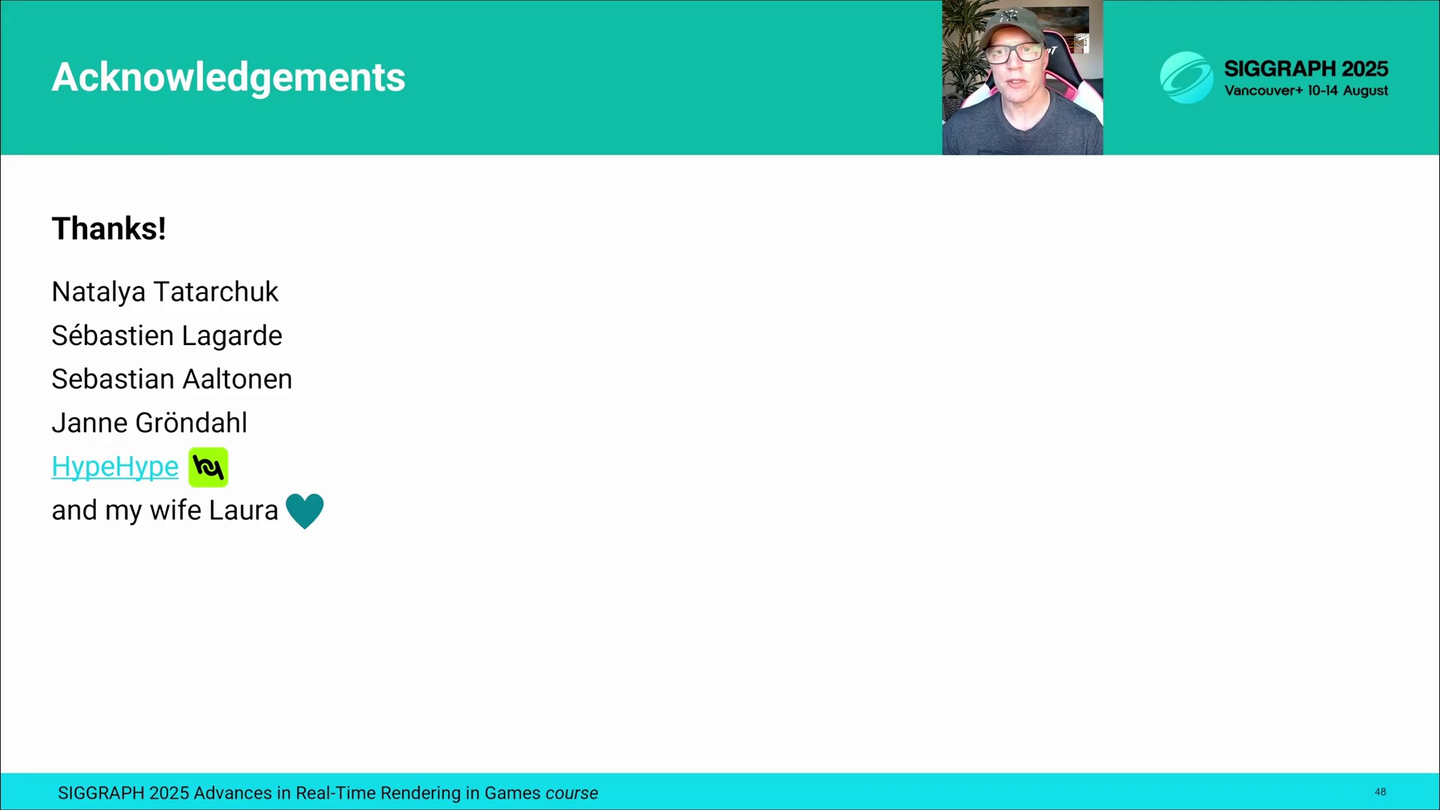 발표를 마치겠습니다. 끝까지 들어주셔서 감사합니다! 발표를 검토하고 준비를 도와준 Natalya Tatarchuk, Sébastien Lagarde, Sebastian Aaltonen, Janne Gröndahl에게 감사를 전하며, 이번 출장에 후원해 준 HypeHype에도 감사드립니다. 마지막으로, 항상 인내심과 지지로 힘이 되어 준 아내 Laura에게 고마움을 전하고 싶습니다.
