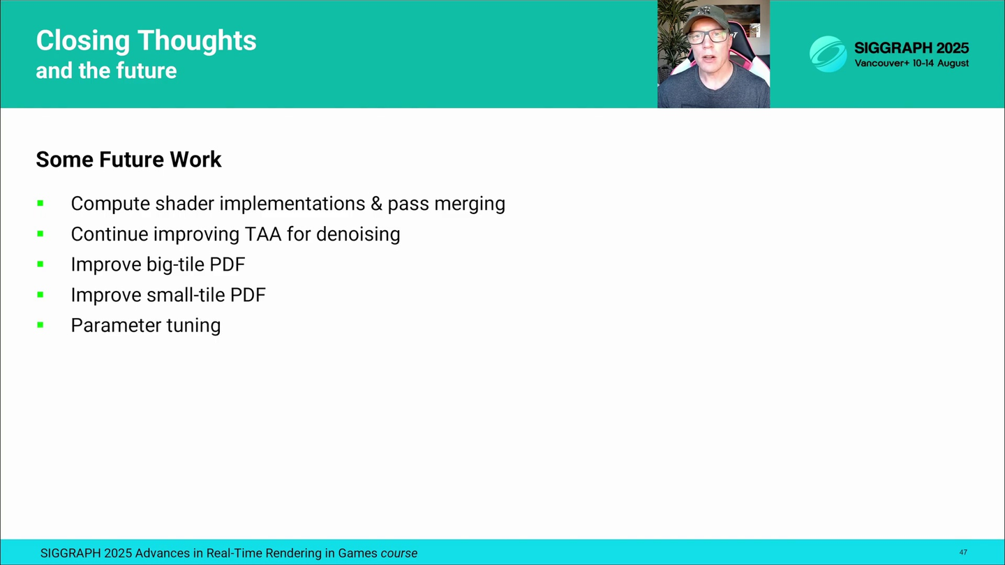 현재 픽셀 셰이더 기반 패스에 대해 컴퓨트 셰이더 버전을 구현하고, 다양한 기기에서 성능을 분석할 계획입니다. 모바일에서도 효과를 볼 수 있는 ALU 및 대역폭 최적화 여지가 많습니다. 컴퓨트 셰이더를 사용하면 소타일 재샘플링, 그림자, 조명 등 마지막 세 패스를 하나로 합쳐 PC·콘솔에서는 물론 일부 모바일 기기에서도 의미 있는 성능 향상을 기대할 수 있습니다.