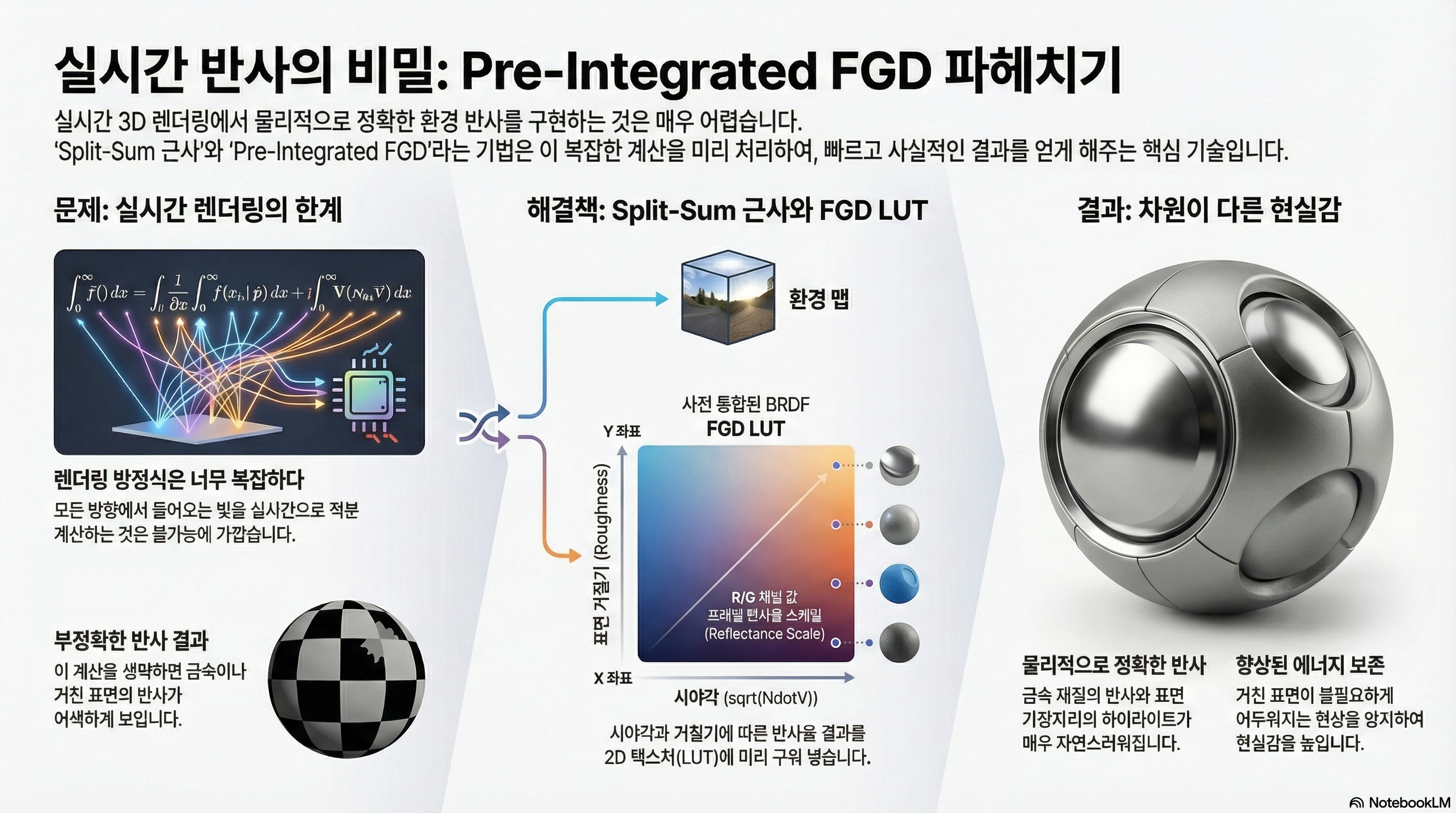 이 글은 유니티 URP 환경에서 물리 기반 렌더링(PBR)의 시각적 완성도를 높이기 위한 Pre-Integrated FGD 구현 방법을 상세히 설명합니다. 실시간 계산이 어려운 렌더링 방정식을 해결하기 위해 Split-Sum Approximation 기술을 활용하여 반사 데이터를 효율적으로 처리하는 원리를 다룹니다. 특히 FGD LUT를 활용해 프레넬 효과와 기하학적 감쇠를 미리 계산함으로써 연산 효율과 물리적 정확성을 동시에 확보하는 과정을 보여줍니다. 또한 거친 표면에서의 에너지 손실을 보완하는 Chan Diffuse 확장 모델을 소개하며 더욱 사실적인 재질 표현법을 제시합니다. 결과적으로 이 자료는 고품질 그래픽 구현을 위한 이미지 기반 라이팅(IBL)의 핵심 수학적 배경과 실무적인 셰이더 최적화 기법을 포괄하고 있습니다.