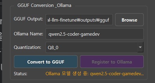 훈련 탭에서 14B 모델을 16bit 그대로 훈련 시킵니다. Ollama 에 업로드 하기 위해서 Guff 형식으로 변환 해 주고 "Q8_0" 설정으로 양자화 해서 등록 해 줍니다. 로컬 컴퓨터 스팩에 따라 16b 는 응답이 매우 느리거든요. 적당한 응답속도 보장을 위해서 "Q8_0" 설정으로 양자화 했습니다.