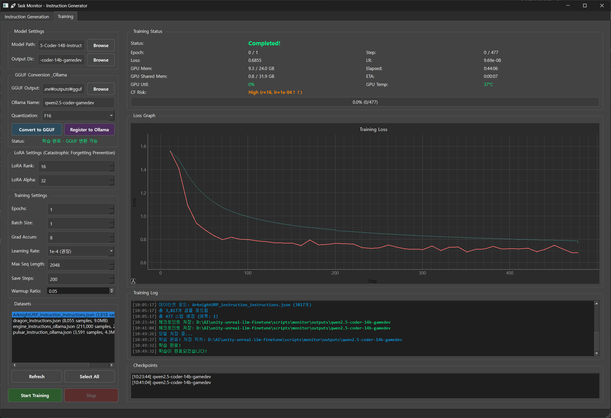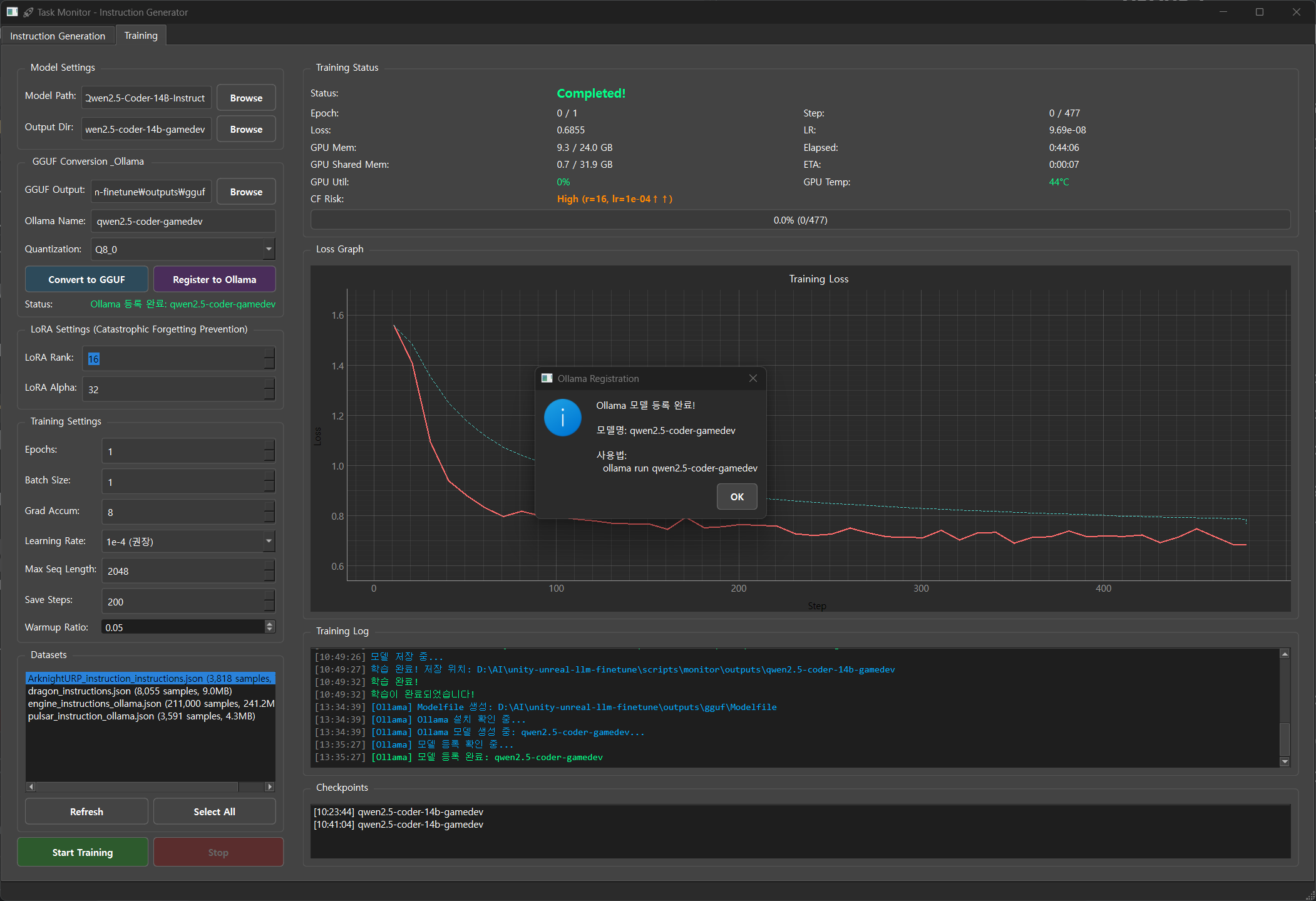 좀 작은 모델로도 충분 해 보여서... models--unsloth--Qwen2.5-Coder-14B-Instruct-bnb-4bit 로 갈아타니까 이제 좀 앞이 보입니다. 여러모로 아직은 Loss 값이 왜 이렇게 높은지... 원... 파라메터 튜닝 좀 해야할거 같습니다.