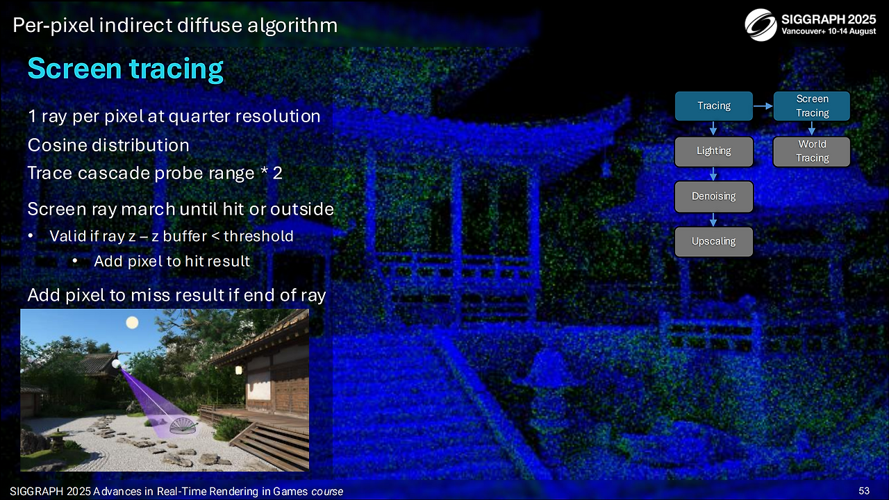레이 방향은 코사인 분포 기반의 중요도 샘플링으로 정하고, 최대 레이 길이는 픽셀 위치가 카메라에서 얼마나 멀리 있는지에 따라 가변적으로 조정합니다. 카메라에서 멀어질수록 더 긴 레이를 쏘게 됩니다.