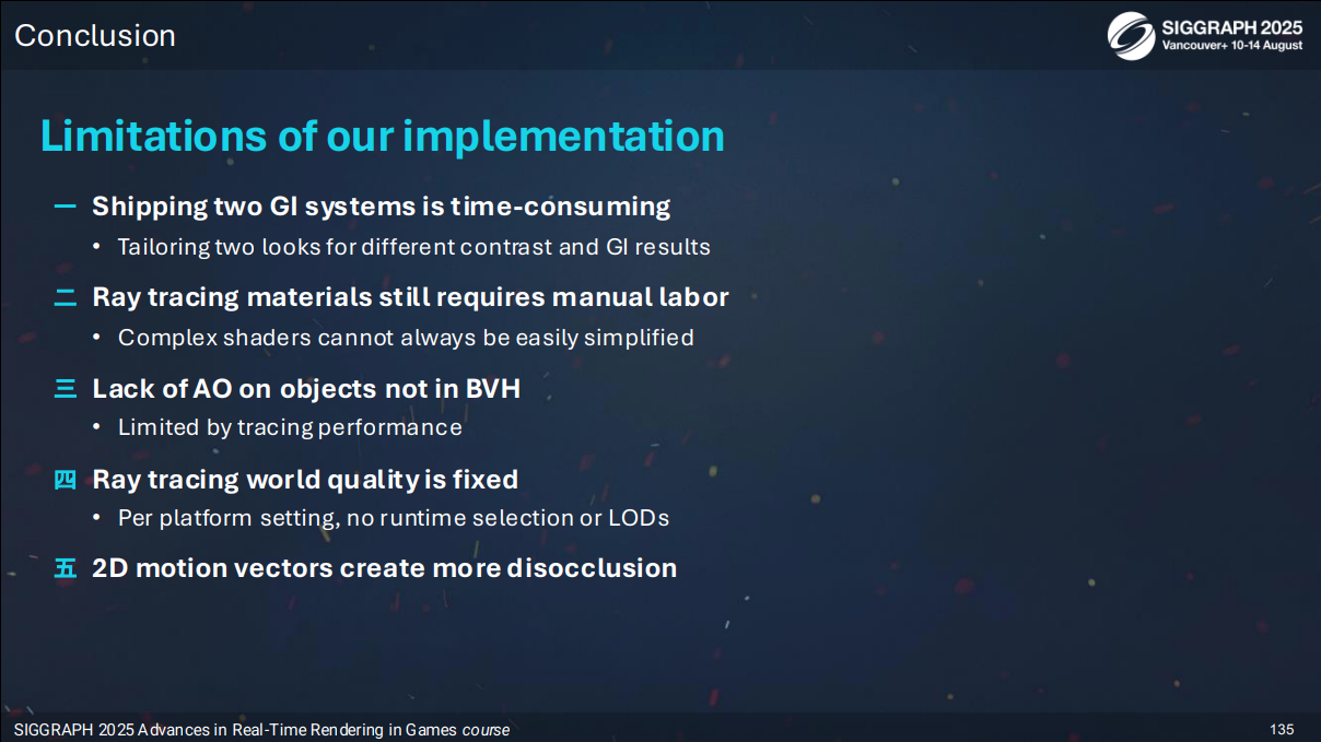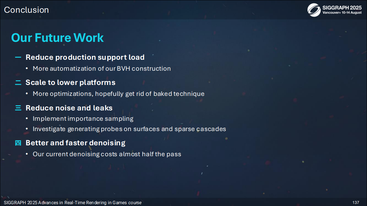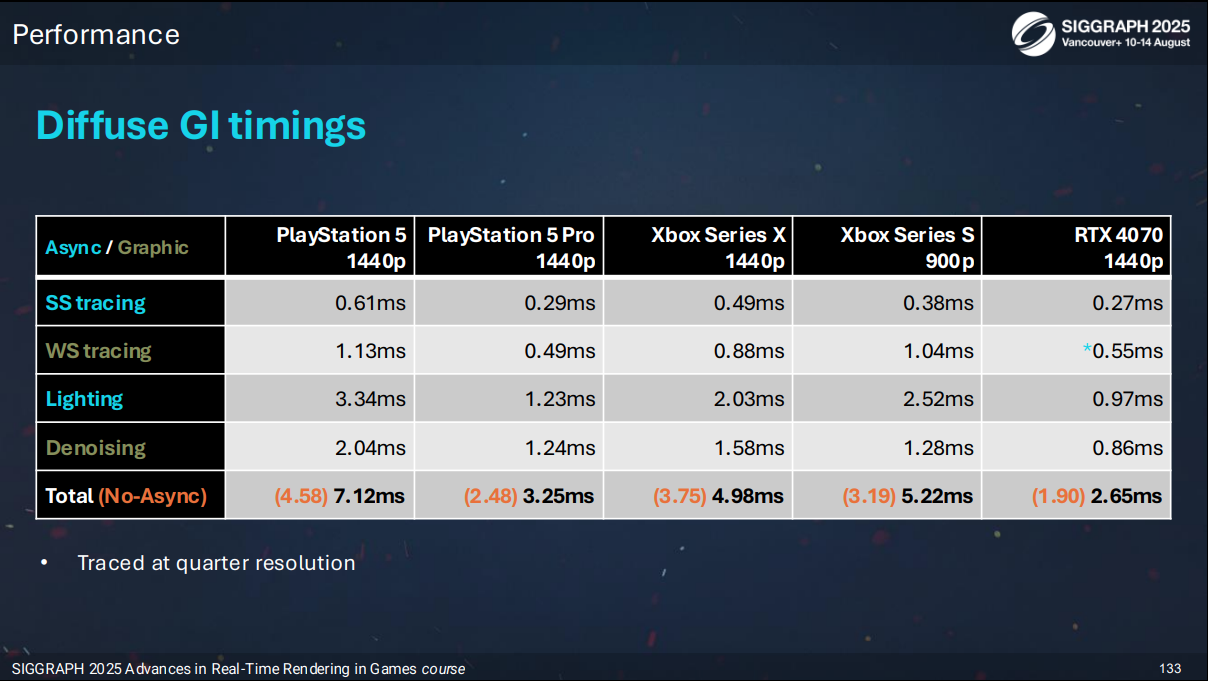 - PS5 Pro 기준으로는 하프 해상도에서도 비용이 꽤 높은 편이지만, 쿼터 해상도에서의 품질이 만족스럽지 않았고, 목표 프레임레이트와 해상도도 이미 만족하고 있었기 때문에 하프 해상도를 그대로 유지했습니다.