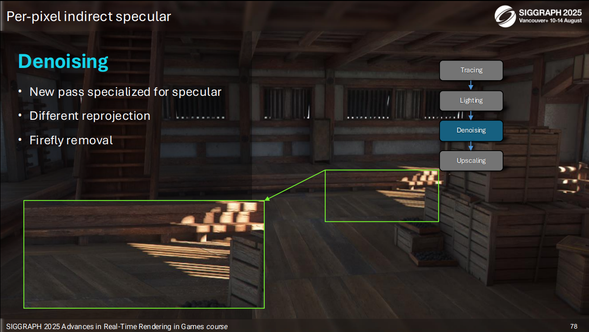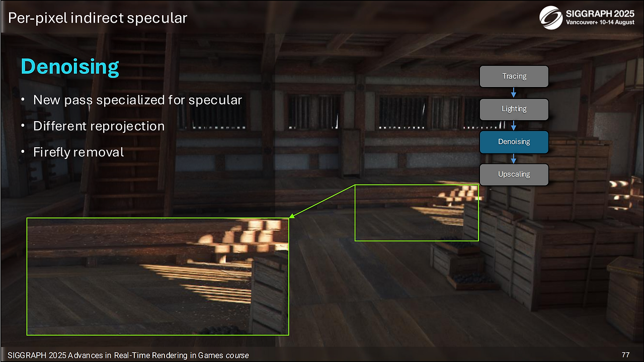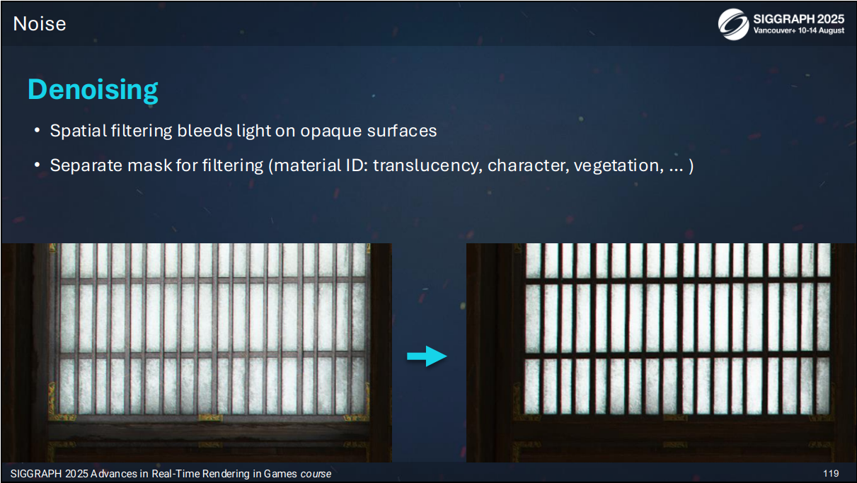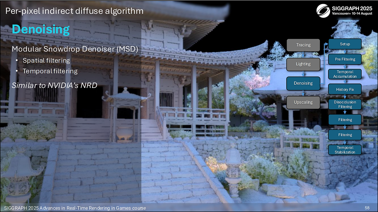 여기서 사용하는 디노이저는 NVIDIA NRD를 기반으로 Snowdrop 엔진에서 튜닝한 버전을 다시 한 번 수정한 형태입니다.[NRD 레포: https://github.com/NVIDIARTX/NRD]