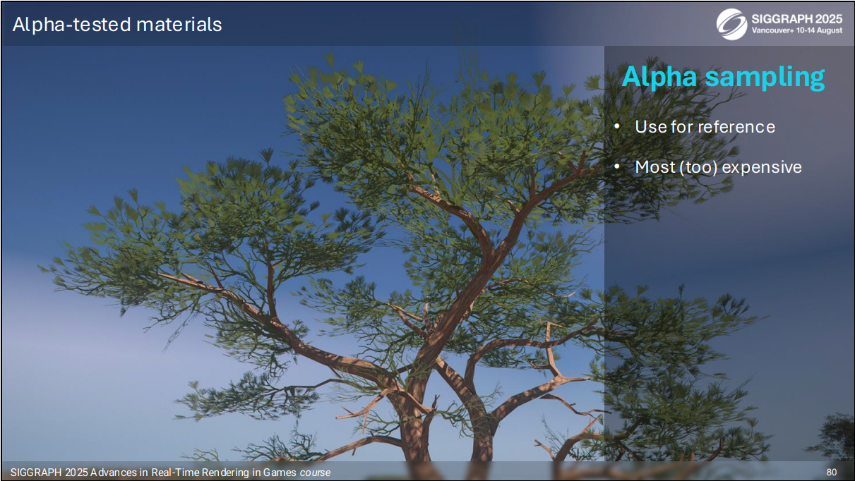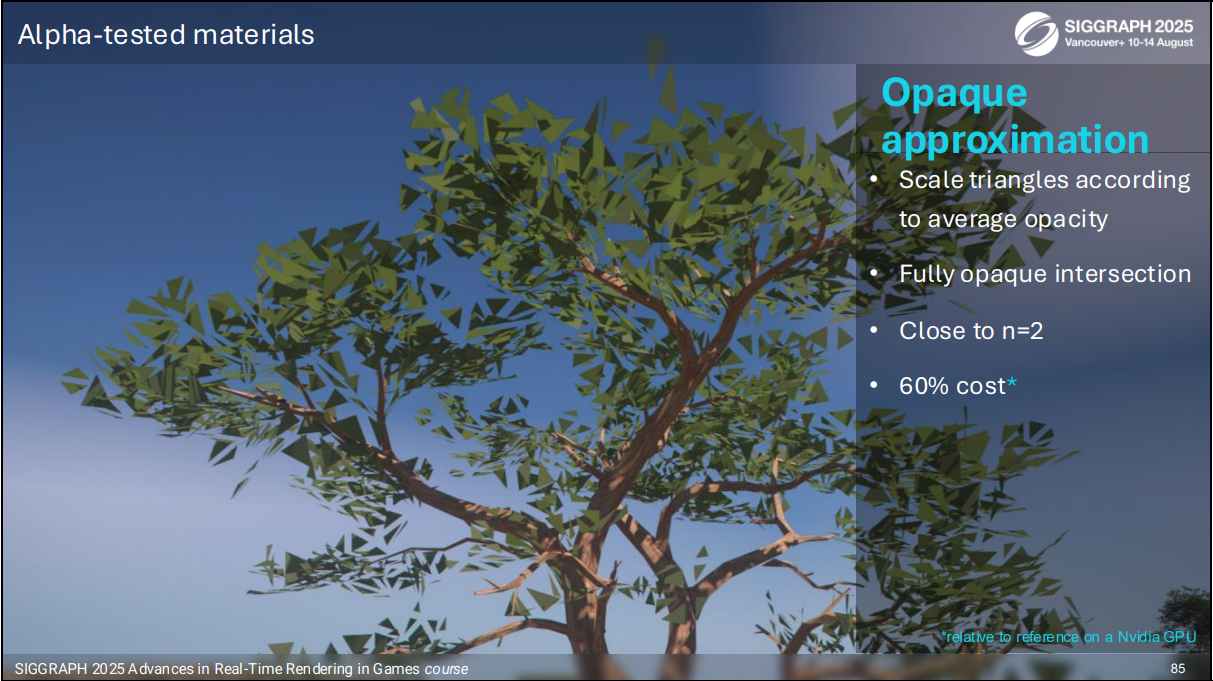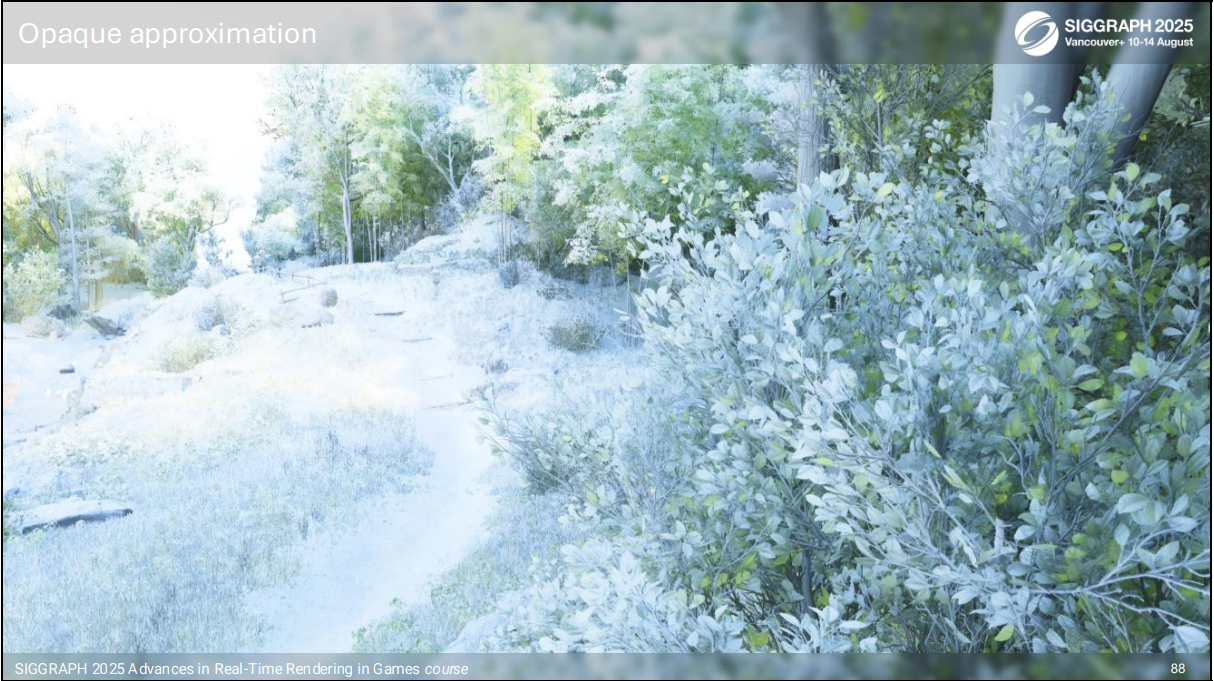 지금 슬라이드에 보이는 것처럼, 나뭇잎 덩어리가 너무 두꺼운 덩어리처럼 보이거나, 반사 안에 이상하게 과한 차폐가 생기는 식입니다. 불투명 근사 자체에 대한 자세한 이야기는 뒤 챕터에서 다시 다루겠습니다.