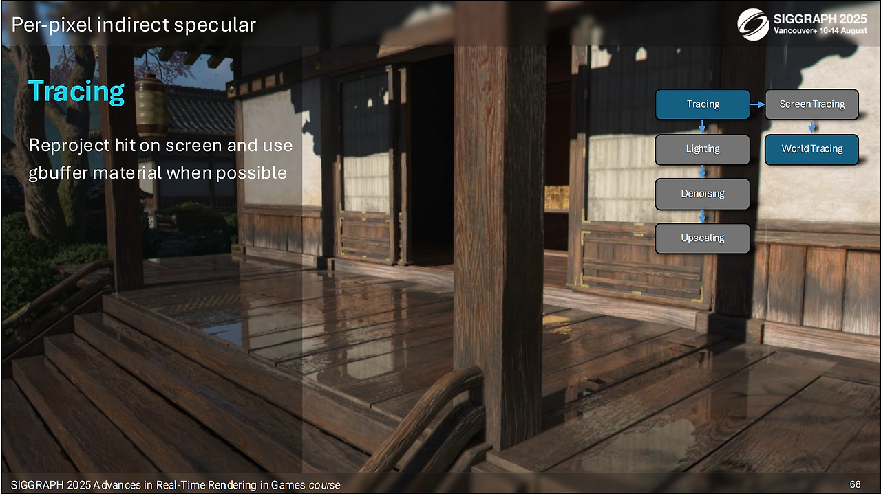 이를 완화하기 위해, 가능한 경우에는 스페큘러 히트 지점을 다시 화면으로 재투영해서, 고해상도 G-버퍼에서 머티리얼 정보를 가져오는 방식을 사용합니다.