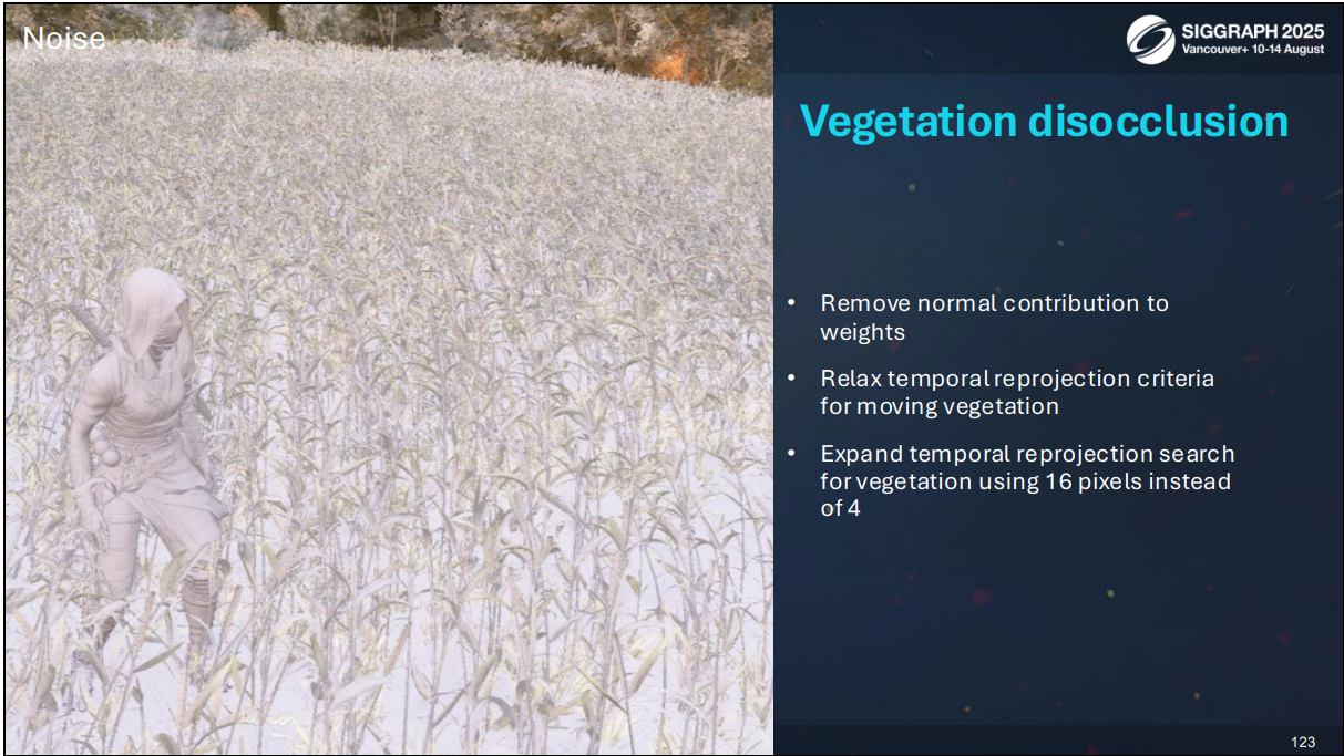 바람에 흔들리는 키 큰 풀(blades of grass)은 노멀 변화도 크고 디소클루전도 강하기 때문에, 일반 디노이저 설정만으로는 깔끔하게 정리하기 어렵습니다.
